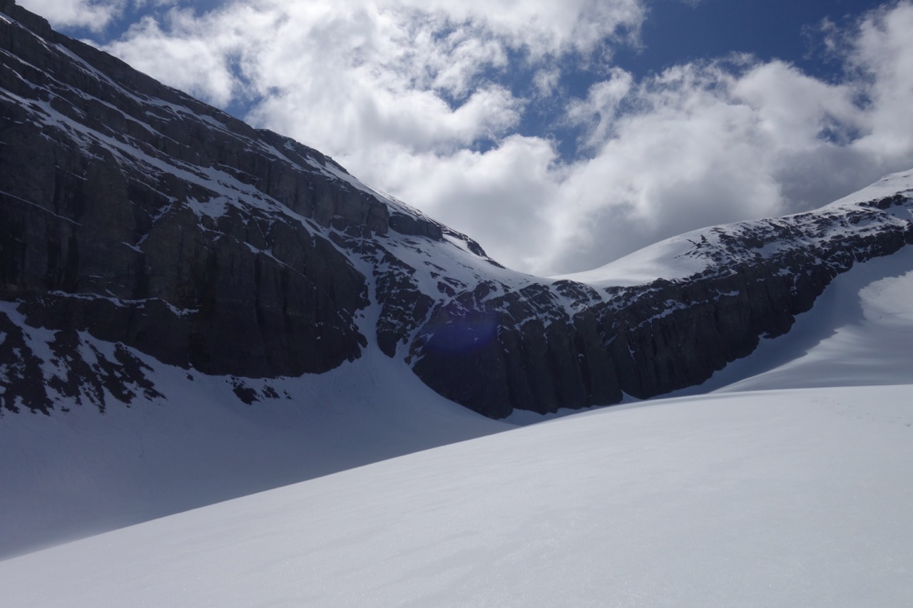 Conditions on the face were very favourable to a quick ascent thanks to optimal snow coverage. There was no sign of the bergshrund on the side that we ascended. Aside from the occasional deeper section, step kicking was excellent with mostly boot top foot penetration .