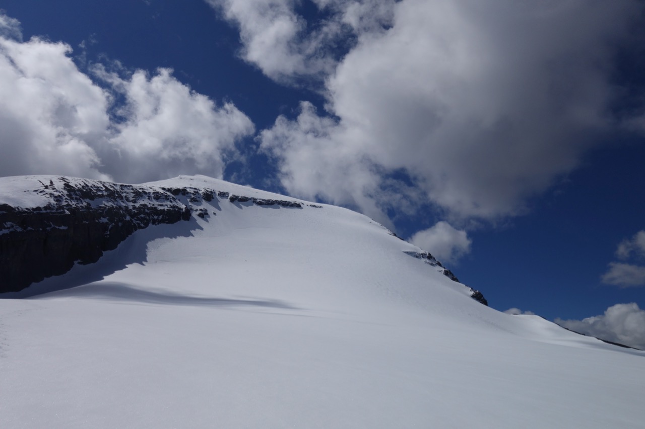 The upper summit ridge is still holding considerable cornices.