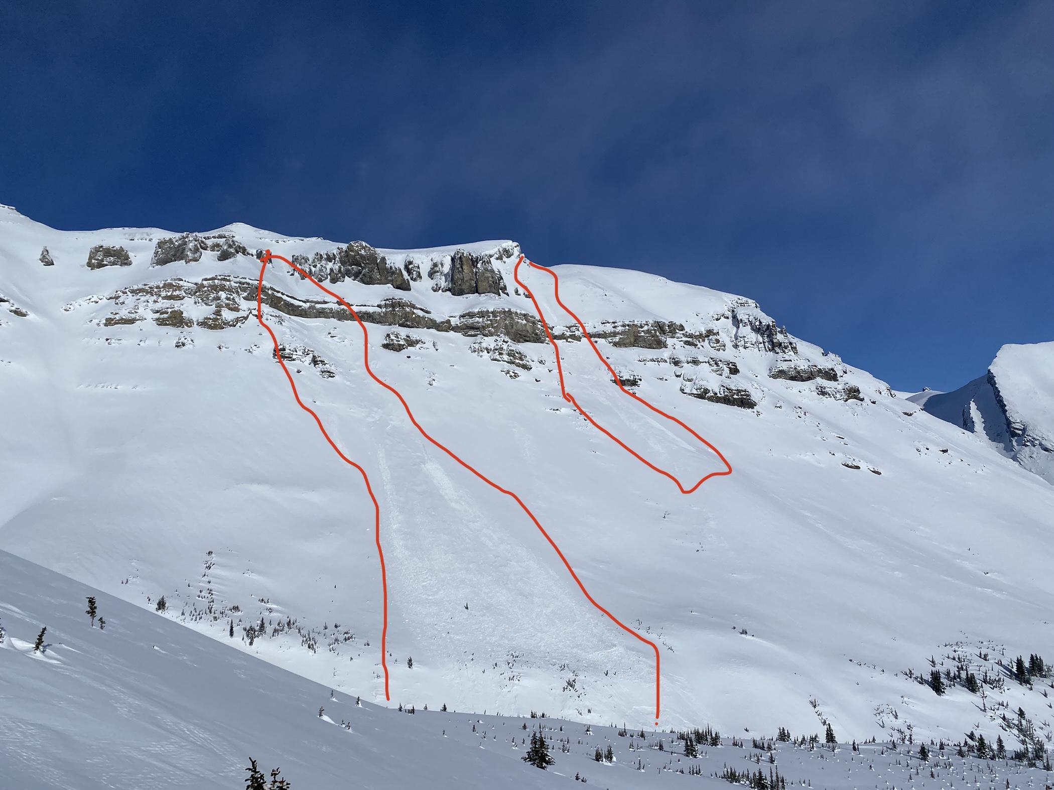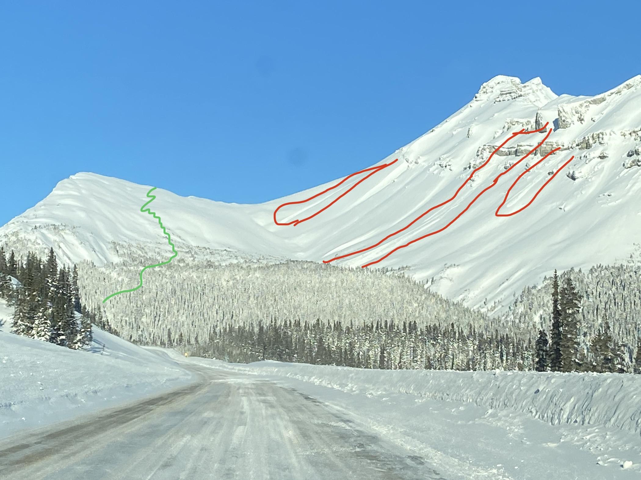 We enjoyed riding in Nigel Basin in beautiful inversion conditions on some conservative albeit glorious slopes. It was a calm balmy -10 at 2400m when down in the Bow Valley it was -30. On the opposite side of the valley there was much more evidence of wind since the last storm. Several size 1.5 - 2 Natural Windslabs were triggered most likely by snow falling from the steep cliffs, on the South Ridge of Mt Nigel in the last 12 hrs.