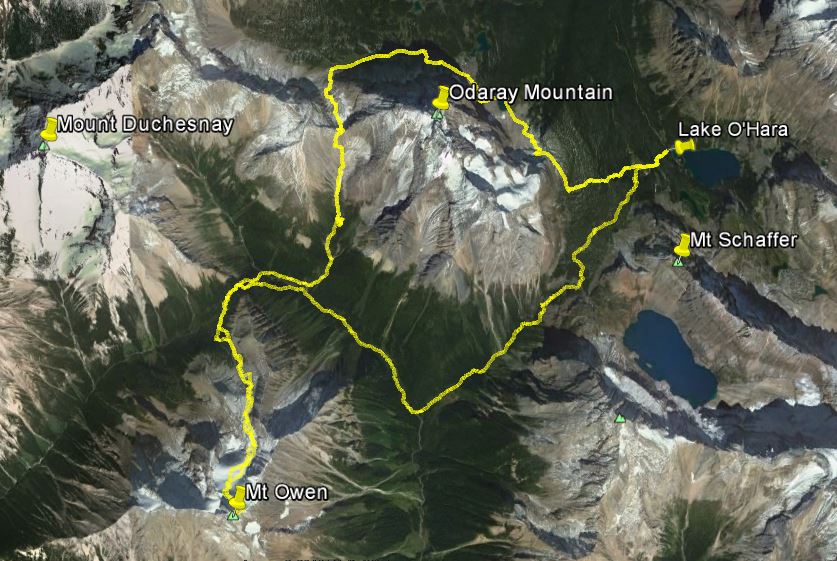 From Lake O'Hara we skied over McArthur Pass, into McAthur Creek, and up to a camp on the W side of the pass between Mt Owen and Mt Duchesnay at 2150 m. We climbed and skied the North glacier on Mt Owen on the second day, returning to camp just in time to meet a wolverine who was quite curious about the intrusion into its backyard. We spent the afternoon moving camp to a sheltered tree rib south of Odaray Pass at 2220 m. The third day we skied over Odaray Pass to Cathedral Lakes before contouring below Mt Odaray to Morning Glory Lakes, up a shoulder below the Odaray Glacier, and back down Lake O'Hara.