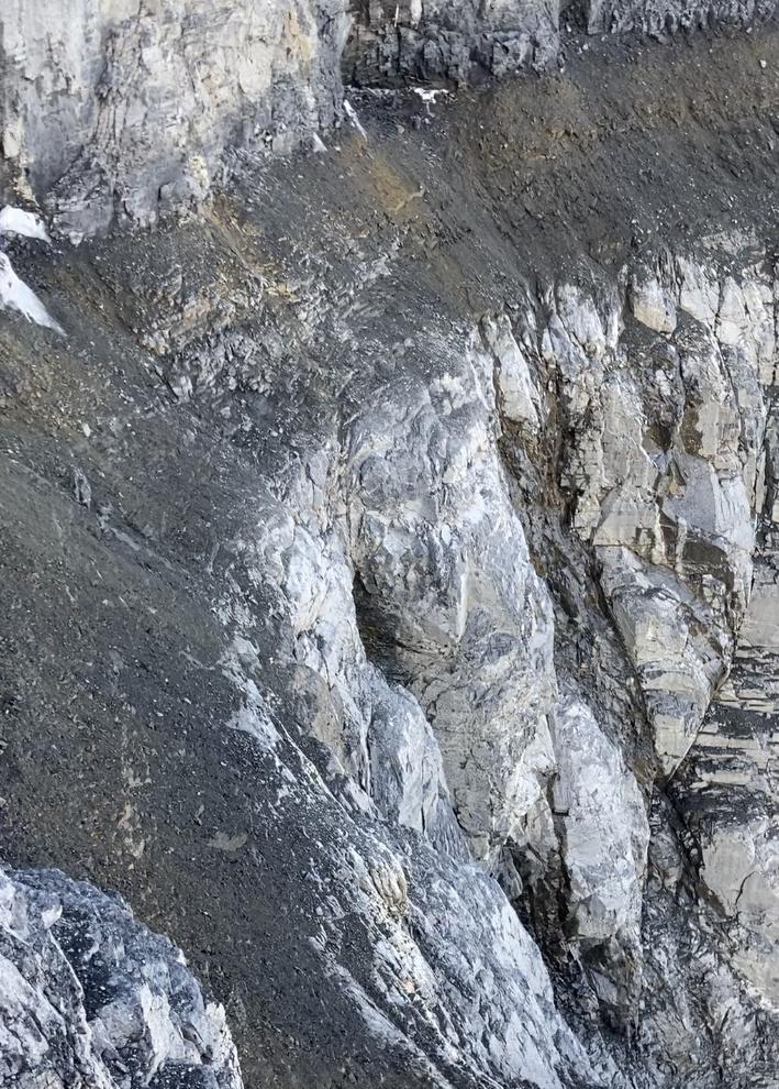 We witness rockfall coming from the arrowhead upper right tongue. To mitigate, we stayed on the left side rock buttress as high as possible before promptly engaging to the arrowhead, above the right tongue.