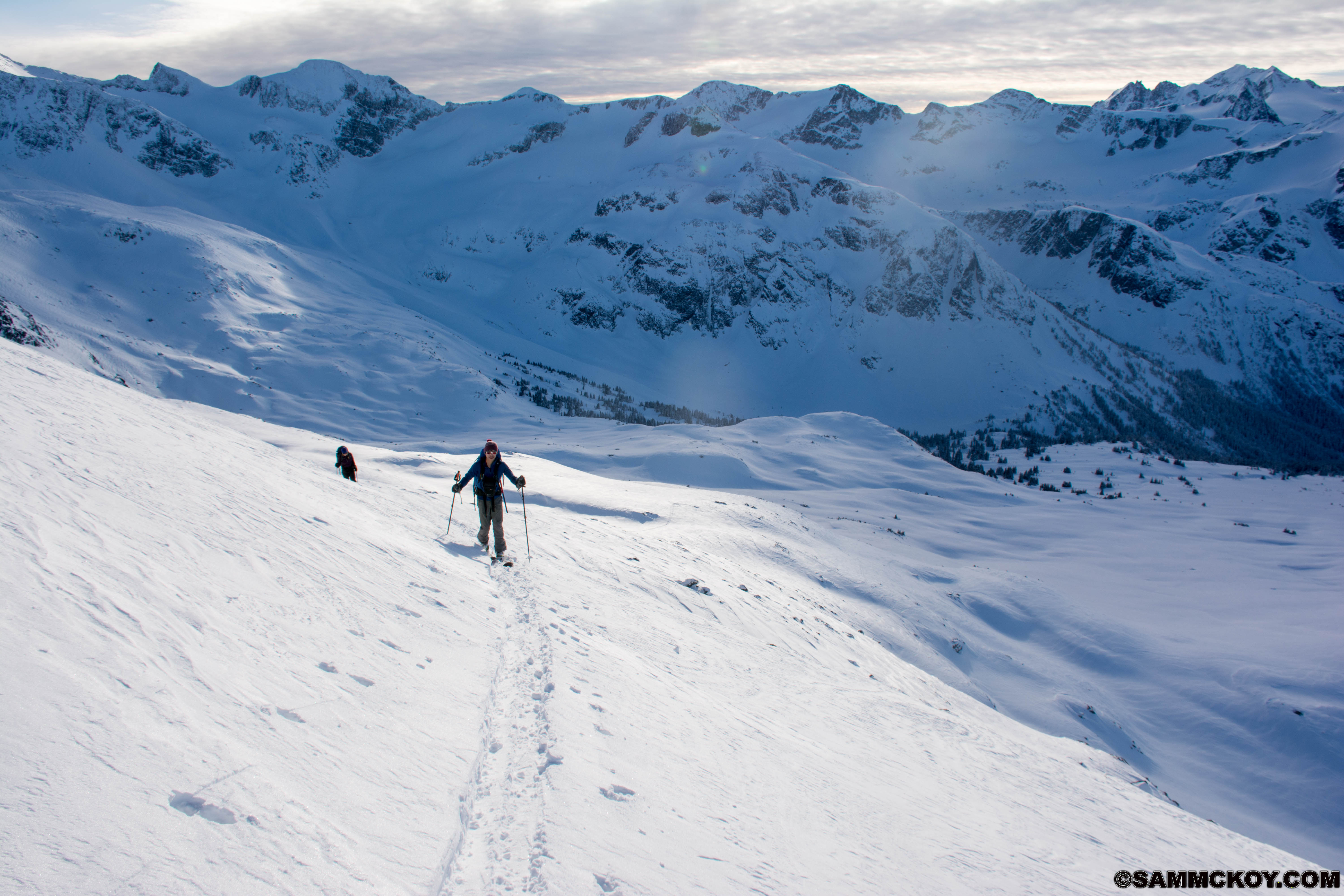 We covered extensive terrain from below treeline to high alpine and all aspects. Glaciers in that area were well filled in and the snowpack is at about 200cm at treeline. Foot penetration was to the waist and ski penetration ranged from 60cm in lower elevations to 20cm where wind affected.