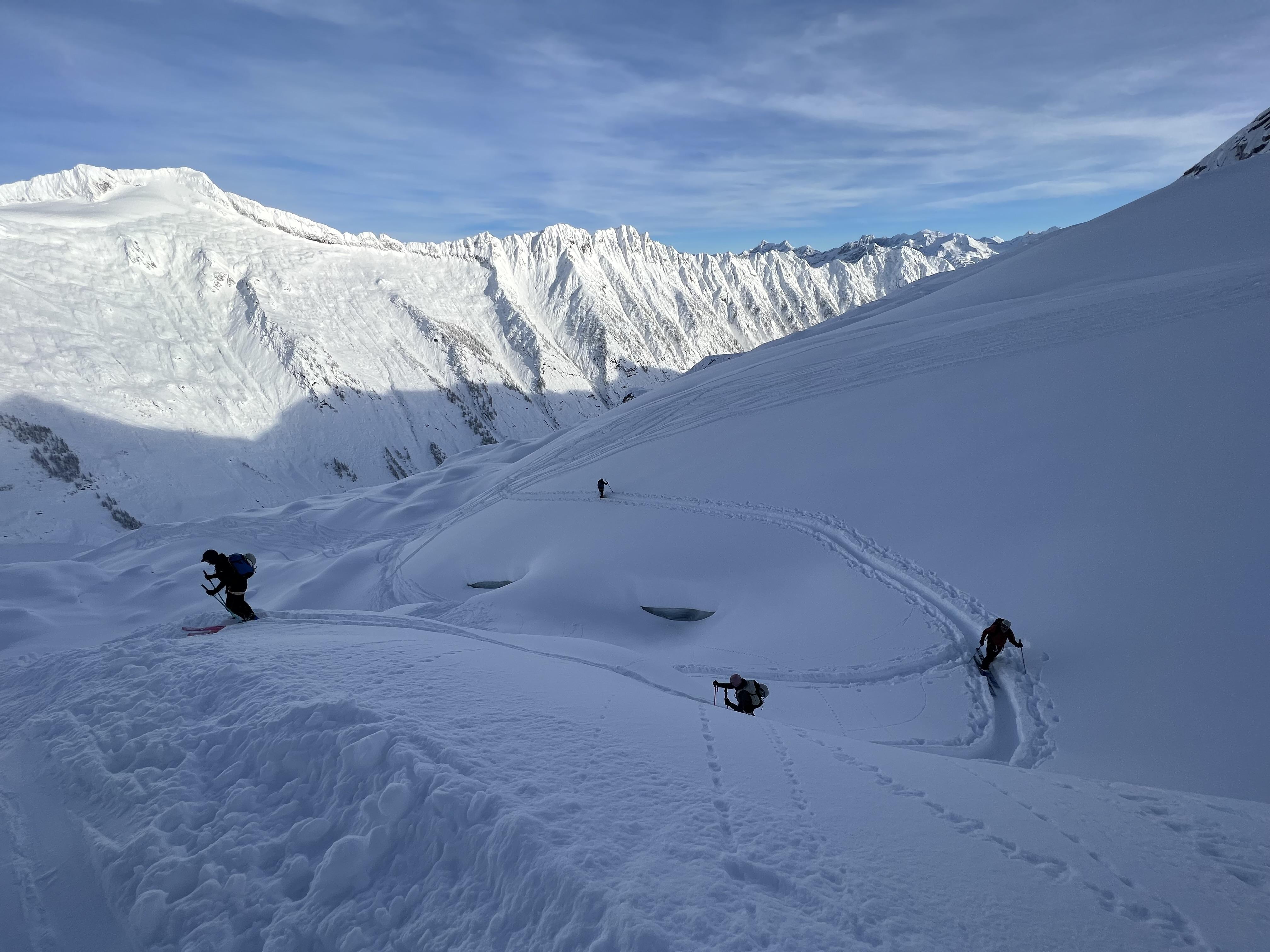 Overall the skiing was exceptional and the new snow offered great low density powder skiing. With the reactivity of the new snow on the Dec. 17/21 PWL, we stuck to terrain with low consequences. With some large avalanches continuing to occur in the Selkirks, its a good time to tone down our terrain choices and stick to small features with little consequence.