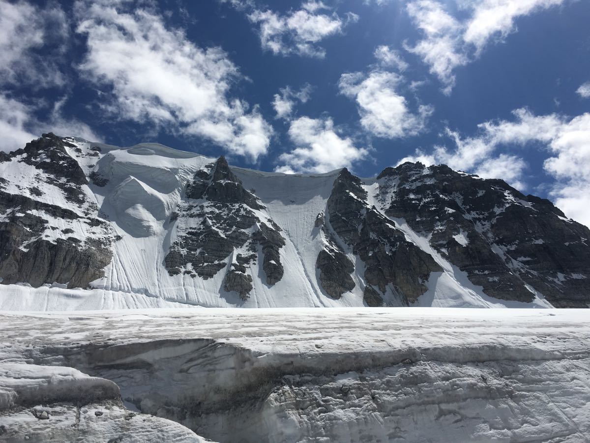 The Canadian Mountain and Ski Guide alpine training course has been in the Neil Colgan area for the last few days. Travel has been variable with little or no overnight freeze and wet snow. We climbed the bottoms of a couple of the north face routes today and found very wet snow conditions that would have been unpleasant had we continued. The attached photo will give you an idea of the current overhead hazard. Also, the group that approached the hut via the Scheisser route reported more rockfall than usual due to lingering snow in some overhead gullies.