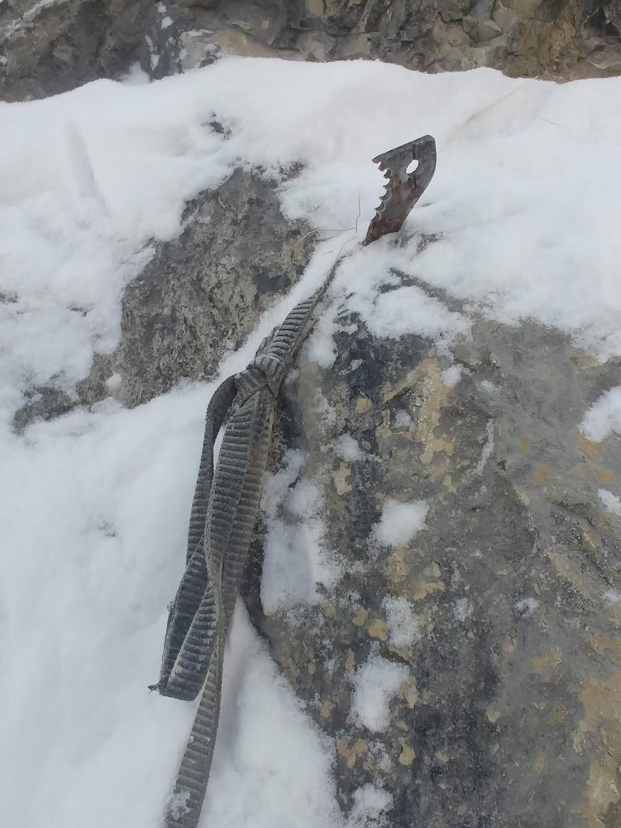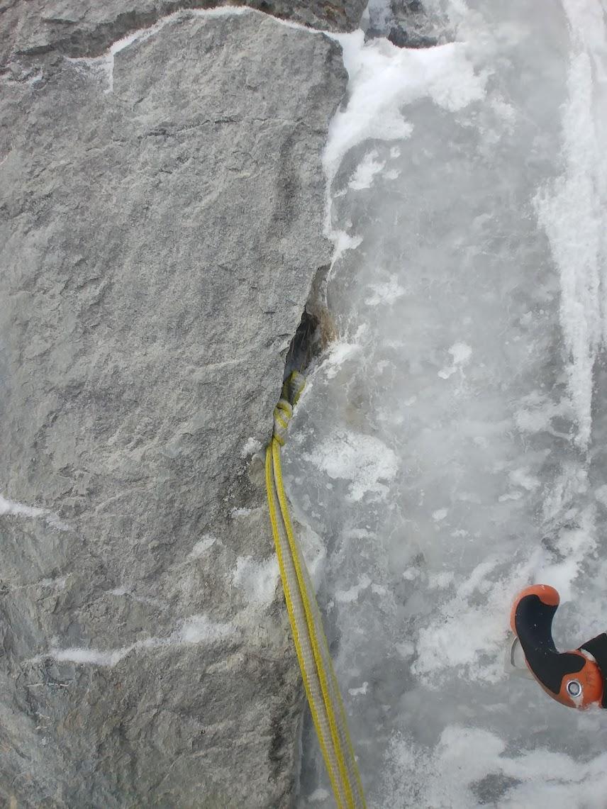 The second pitch traverses left from the bolt anchor to scratch up thin snice past one bolt and then runout, insecure climbing to another bolt with a bail sling on it. Above this my partner got creative with a jam knot between rock and ice (pictured) and then had to scratch his way carefully above this for another 10 m before finding thick enough ice for some stubbies.