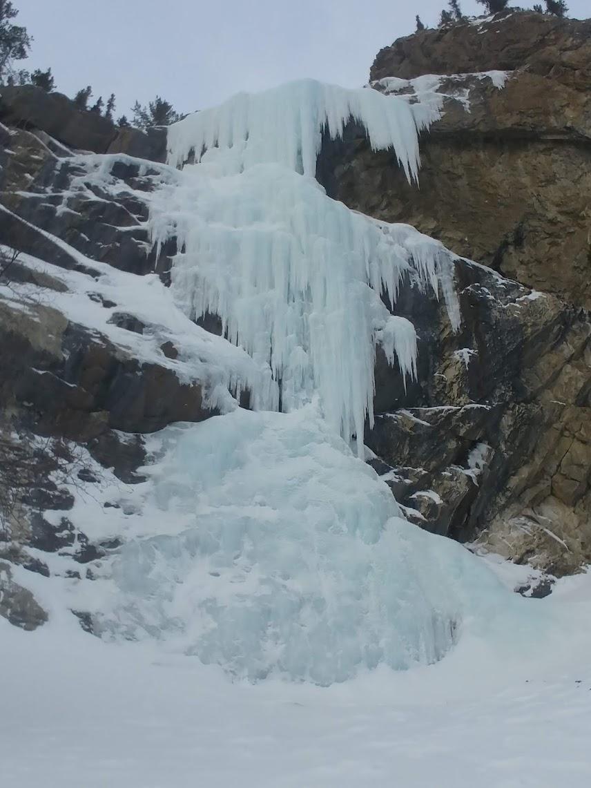 The obvious belay was a good tree in the flat snow above (70 m pitch with six pieces of pro). Supposedly there are six bolts to protect the thin ice, but much snow cleaning revealed only two. There are many obviously good places to position bolts to the climber’s right that would not get so easily buried under snow and make the climbing much safer and more enjoyable.