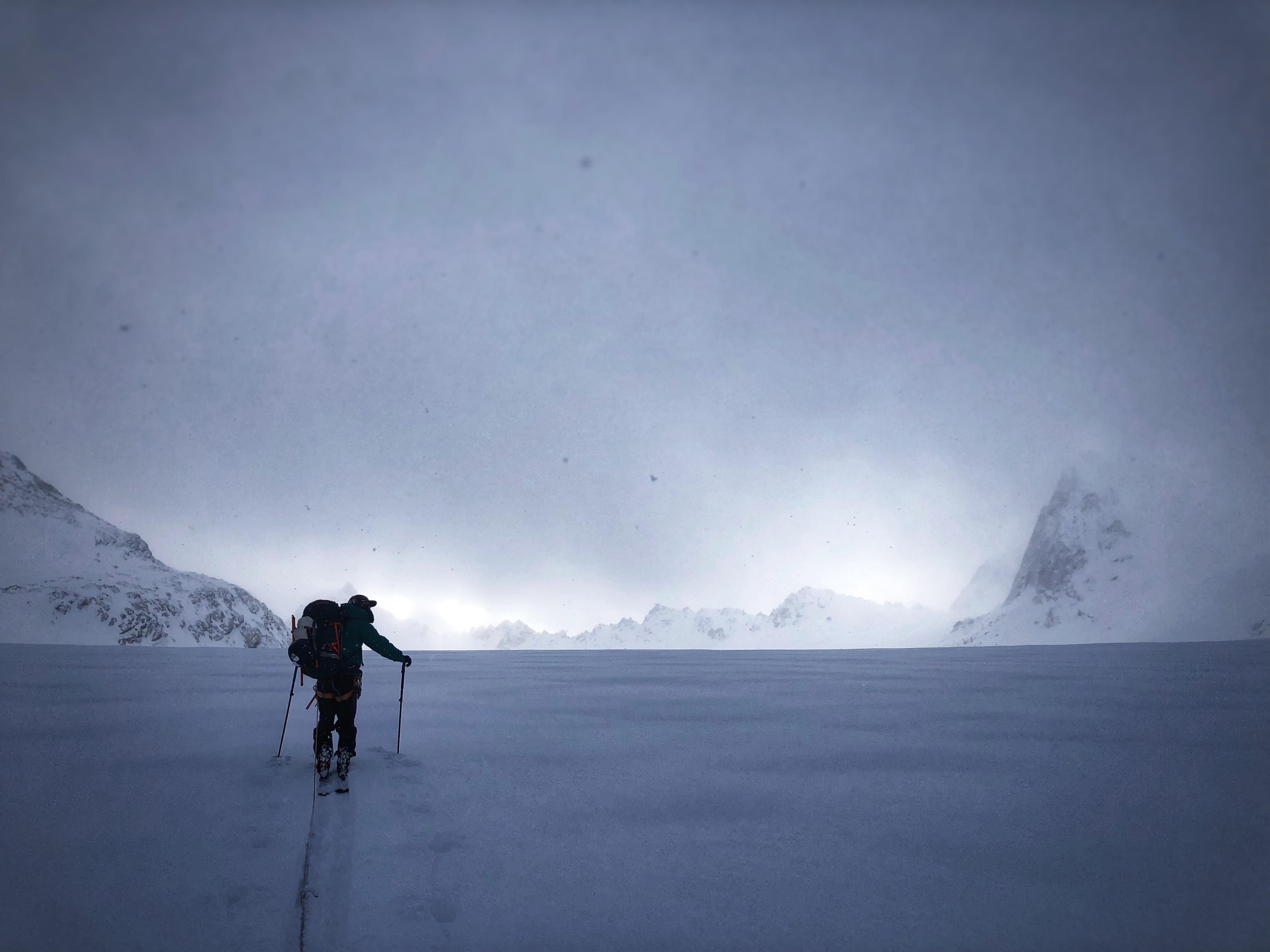 On planar terrain exposed to the wind, 20cm soft snow overlies old wind board. In spite of consistent moderate-strong SW winds, the ski quality remained great and predictable. In couloirs and more constricted terrain, the wind created more variable conditions, from 40-50cm drifts of recent storm snow to pockets of soft wind slab, areas scoured down to crust, and thin faceted spots. The snow was not reactive to skis, and when the skies opened up, we did not see any evidence of natural activity in the basin.