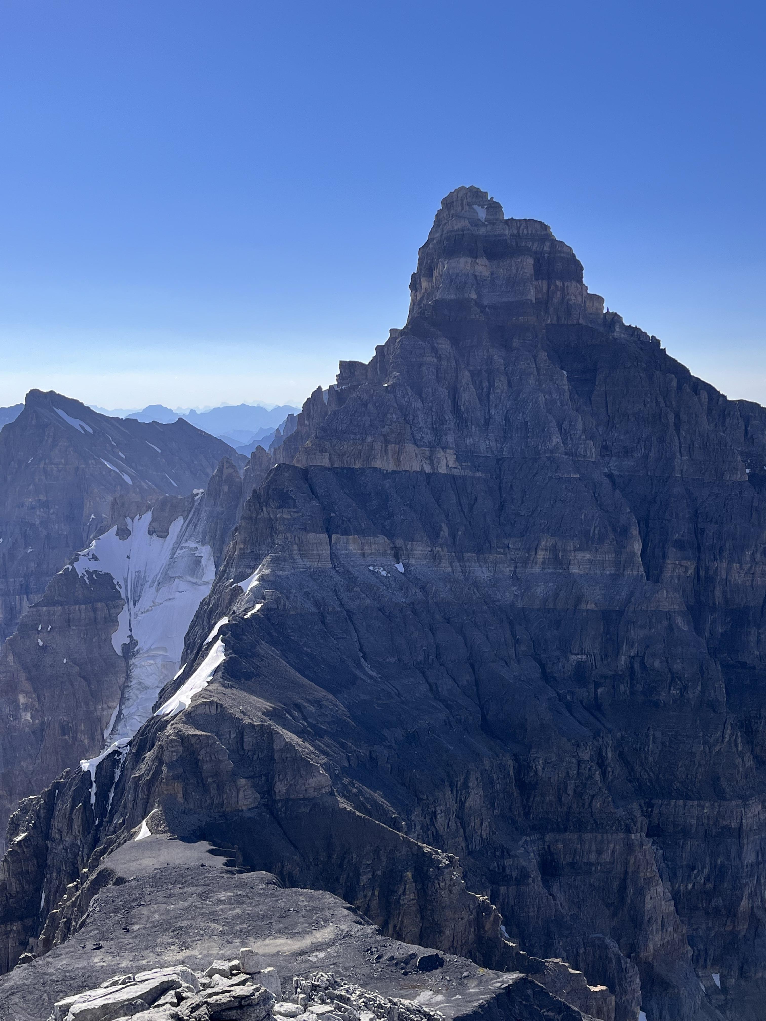 My guest Peter D and I enjoyed dry conditions on Deltaform’s NW ridge Aug 13. No need for crampons and axe yesterday. There is no running water beyond the creeks below Wenkchemna pass but there are snow patches starting near the summit of Neptuak and the N-D col for snow melt.