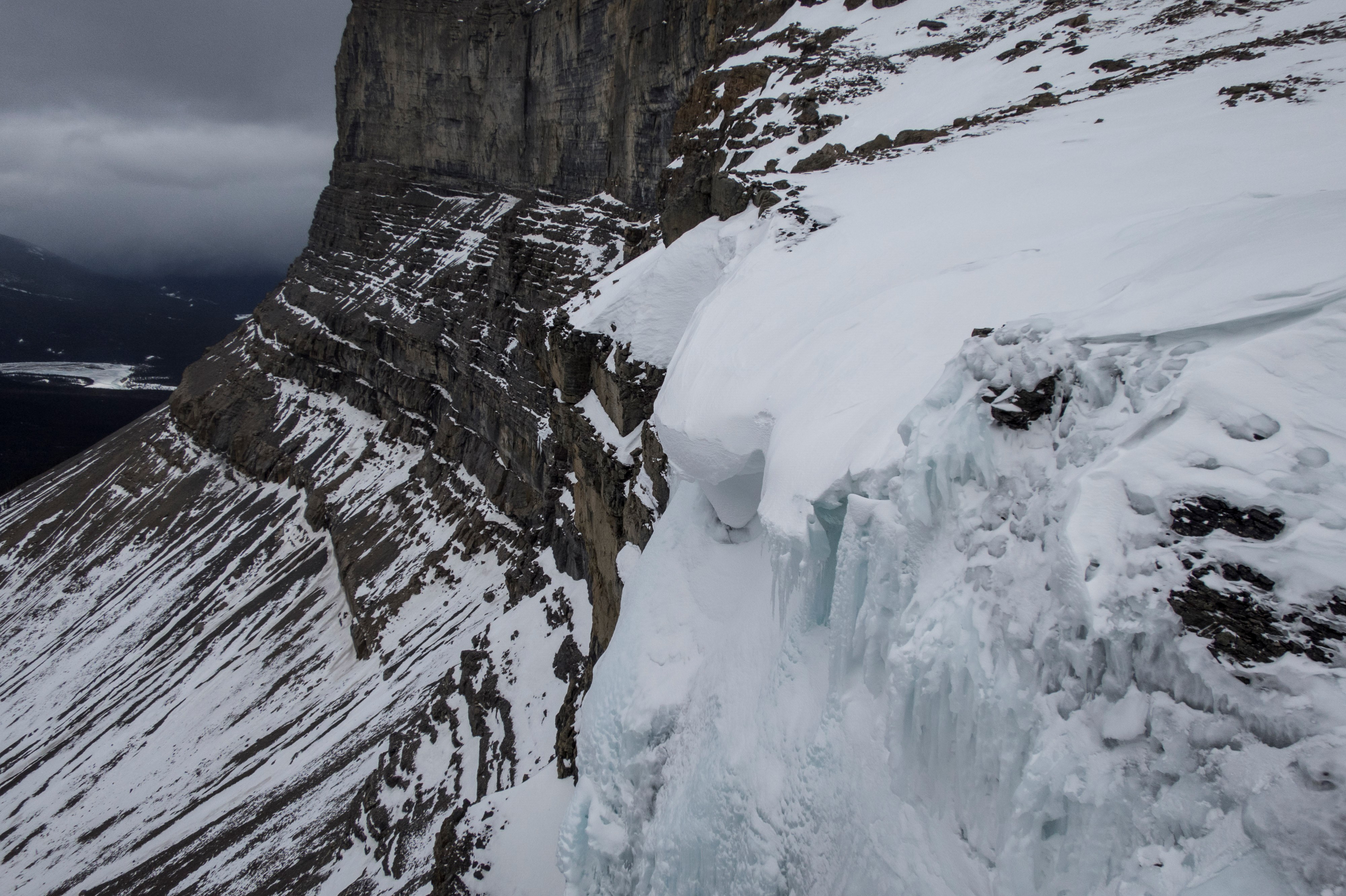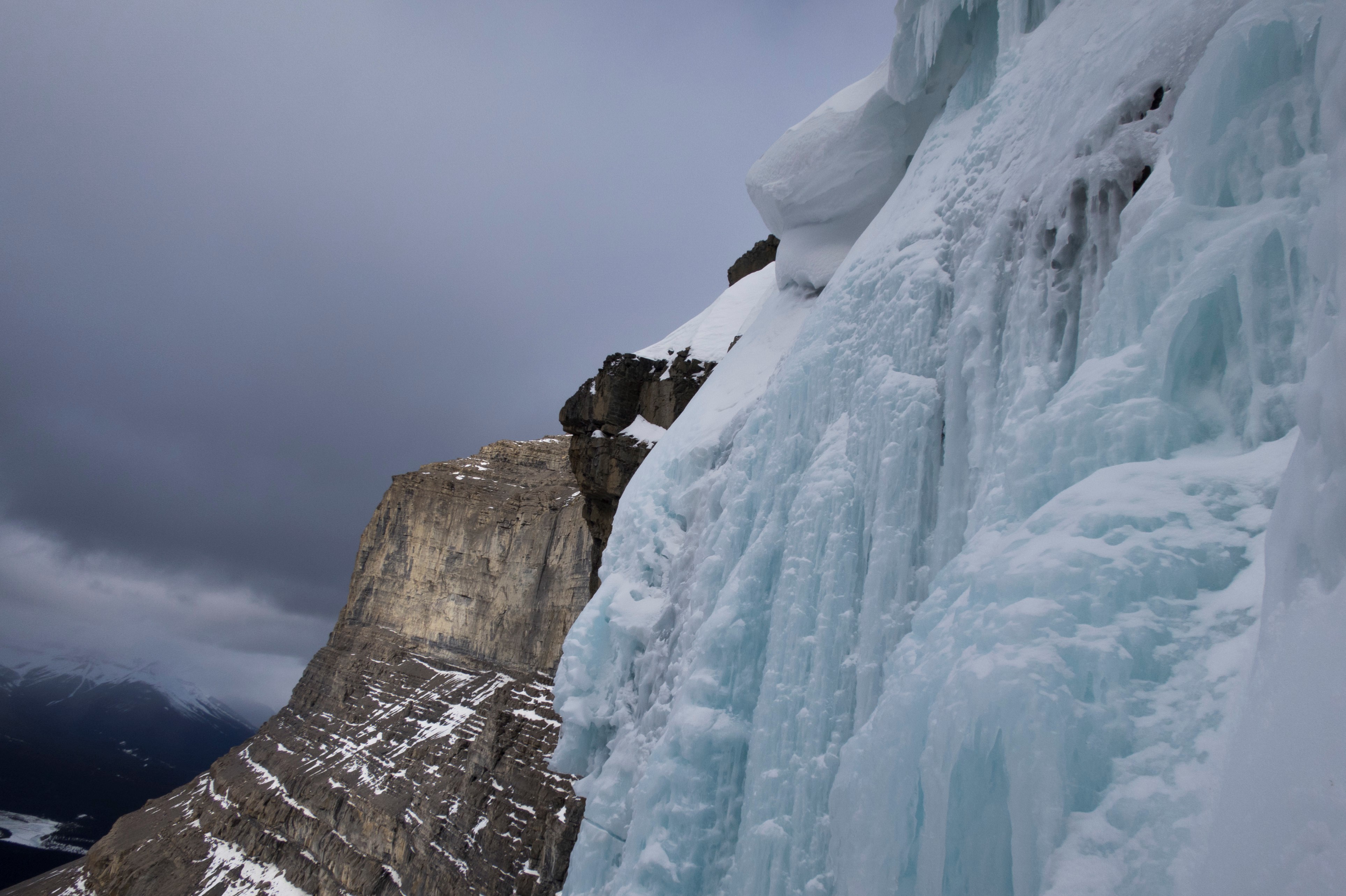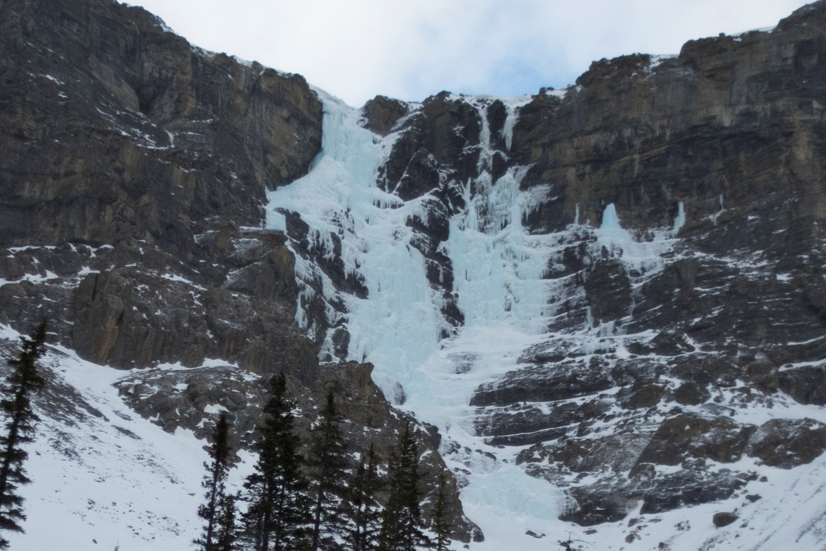 " ... there is a cornice, but it’s not terribly menacing (or at least it wasn’t as of the 12th). It hangs way to the left of the flow and actually looked pretty well supported when we were there, but we climbed on the far, far right and weren’t under it anyway. I’ve attached a couple pictures in case they’re a useful conditions report for anyone else, and again, these are from the 12th. The far right line was probably 4+ or 5- depending on which line you took. "