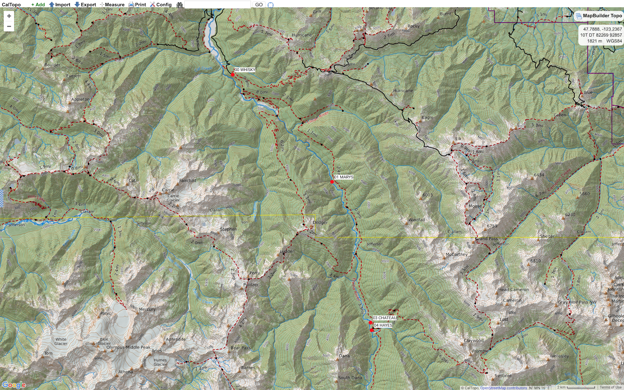 Route: Started at Whiskey Bend Trailhead, 357 m (1171 ft) GR 565129. Day 1, hiked 14.3 km (8.9 mi.) to Marys Falls Camp, 380 m (1247 ft) GR 633055. Day 2, hiked 14.5 km (9 mi.) to Hayes Ranger Station, 516 m (1693 ft) GR 660952 and then Chateau Camp, 499 m (1637 ft) GR 659957. Day 3, hiked 13.2 km (8.2 mi.) to Marys Falls Camp, 380 m (1247 ft) GR 633055. Day 4, hiked 13.9 km (8.6 mi.) to finish at Whiskey Bend Trailhead, 357 m (1171 ft) GR 565129.