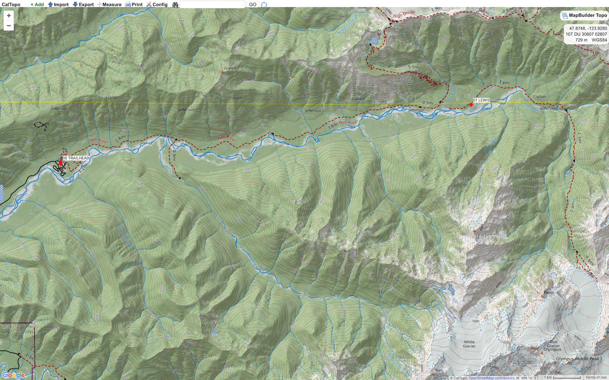 Notes: The Hoh Rainforest is one of the most spectacular examples of temperate rainforest on the planet. The 80.5 km (50 mi.) long Hoh River Valley stretches from the highest peaks in the Olympic Peninsula, Mount Olympus 2432 m (7980 ft), to the shores of the Pacific Ocean. This is an excellent early season valley-bottom backpacking route with a couple of nice options to ascend into the alpine later in the season.