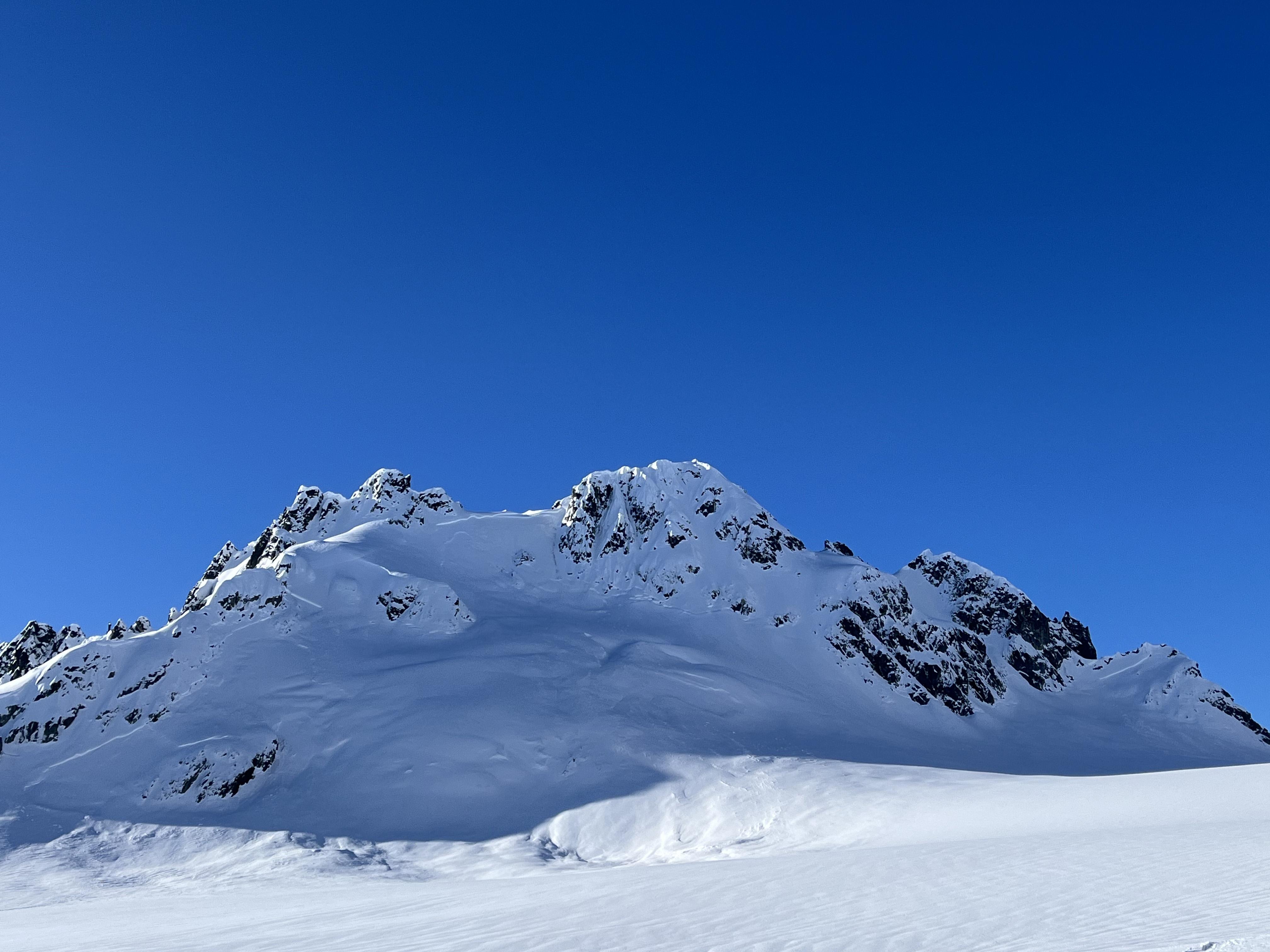 As we downhill skinned quickly across and climbed back up part of the Fitzsimmons glacier towards Overlord Mountain, numerous unsupported large cornices loomed above us. If our group were to climb this route again in the coming week(s), we would opt to climb the southside of Benvolio to avoid the exposure to cornices. Then we chose not to use the Overlord rappel station and avoided the crevasses high on the west facing side. We skied the north facing, low angle (20-30 degree) supported line, on the skiers right hand side of the glacier, avoiding a couple open crevasses and a few sags. The top 5cm plus of snow was mostly soft with a few sections of wind pressed powder, making for the best ski descent of the traverse. The ski tour ascent back up the Overlord glacier towards Whirlwind Peak requires climbing through crevasses (2150m-2200m) and a small section was well-bridged. The Overlord glacier was more open and exposed when compared to the past five seasons.