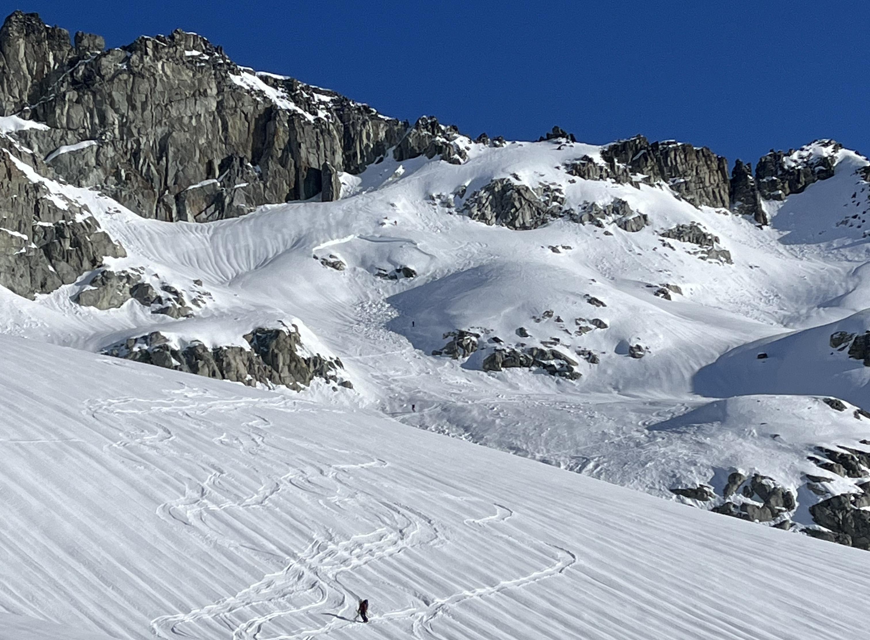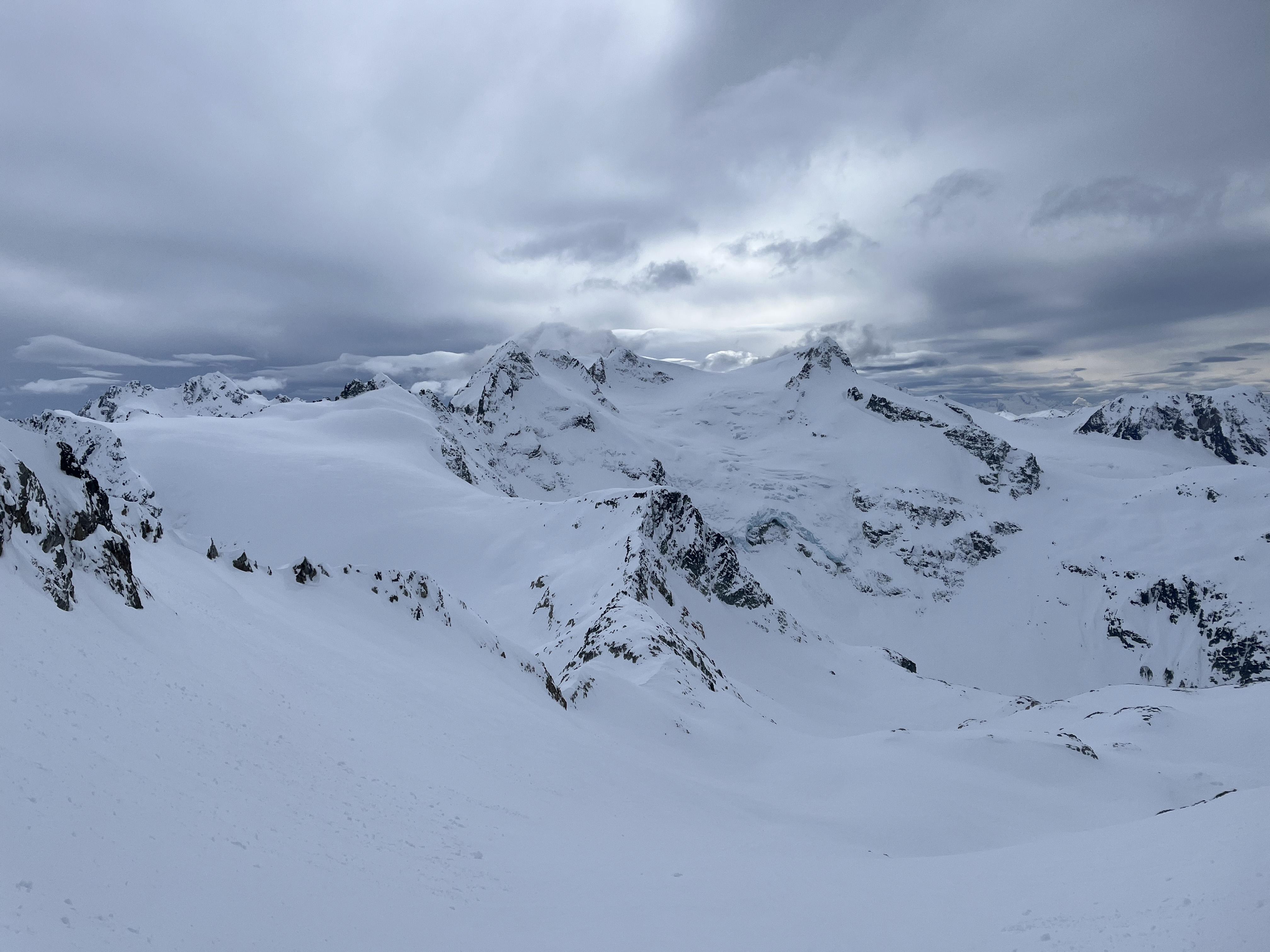 The skiing down Iago Mountain to the Diavolo glacier (S-SE facing) was a difficult combination of runnels, new thin windslab (3-5cm) from the previous night and old avalanche debris from numerous loose wet and one slab avalanche (size 1.5). From 2180m, we ski toured, using our ski crampons again and avoiding the glacier sags, up the SE slope of Mount Benvolio to the col between Benvolio and Mount Fitzsimons (2480m). Some recent rock fall was seen on southerly aspects of Benvolio. The north face of Cheakamus Mountain had several old natural size 2-3 avalanches.