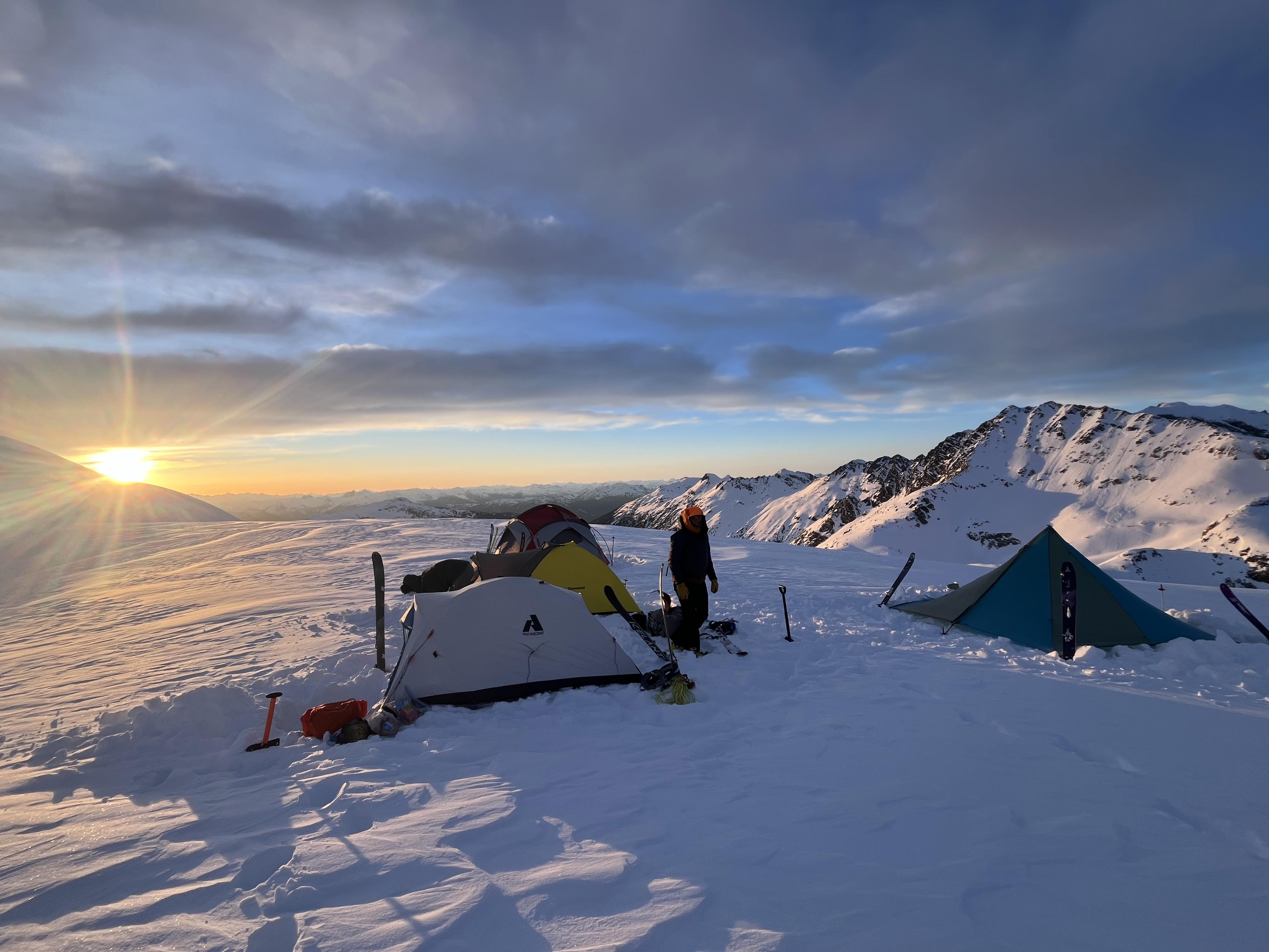 A few open crevasses and sags on the glacier were easy to avoid with high overcast conditions and the flat light. Probed 220cm to 260cm of snow down to a hard ice layer. We ascended to the looker’s right side of Mount Pattison to the end of the glacier. At 2420m, we set the west facing bootpack up to 2440m (south shoulder of Pattison). Ice axes were used for the climb and conditions were a mix of faceted snow closer to the rocks to very firm snow further to the right and therefore made it hard effort to kick solid steps. The slope angle increased to 45 degrees plus at the final five or six steps. Our group descended the northeast side of Tremor glacier to 2220m as visibility diminished and set camp for the night. Temperatures ranged around -5 to -6 Celsius overnight.