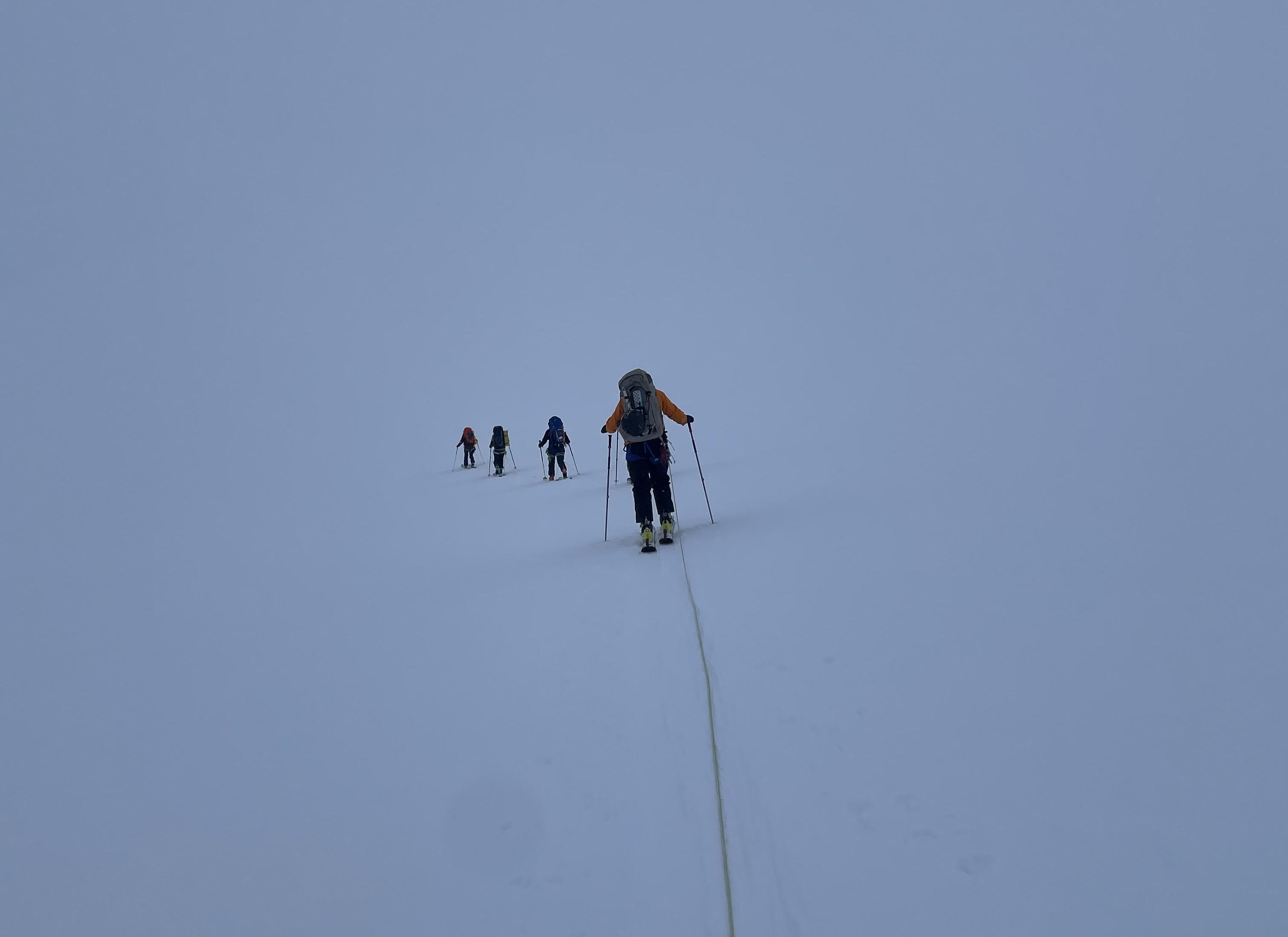 The next morning, we ascended the Tremor glacier roped up with zero visibility, avoiding open crevasses and the blue ice we had spotted on the western side the day before. The group continued east to handrail the far west facing rock wall and attached our ski crampons for extra security before continuing to climb as the slope angle increased (30+ degrees). Height of snow was over 320 cm+ (exceeded the probe length). Near 2600m, the group crossed a well-bridged bergschrund before bootpacking the firm melt-freeze crust the last 10 meters to the col.