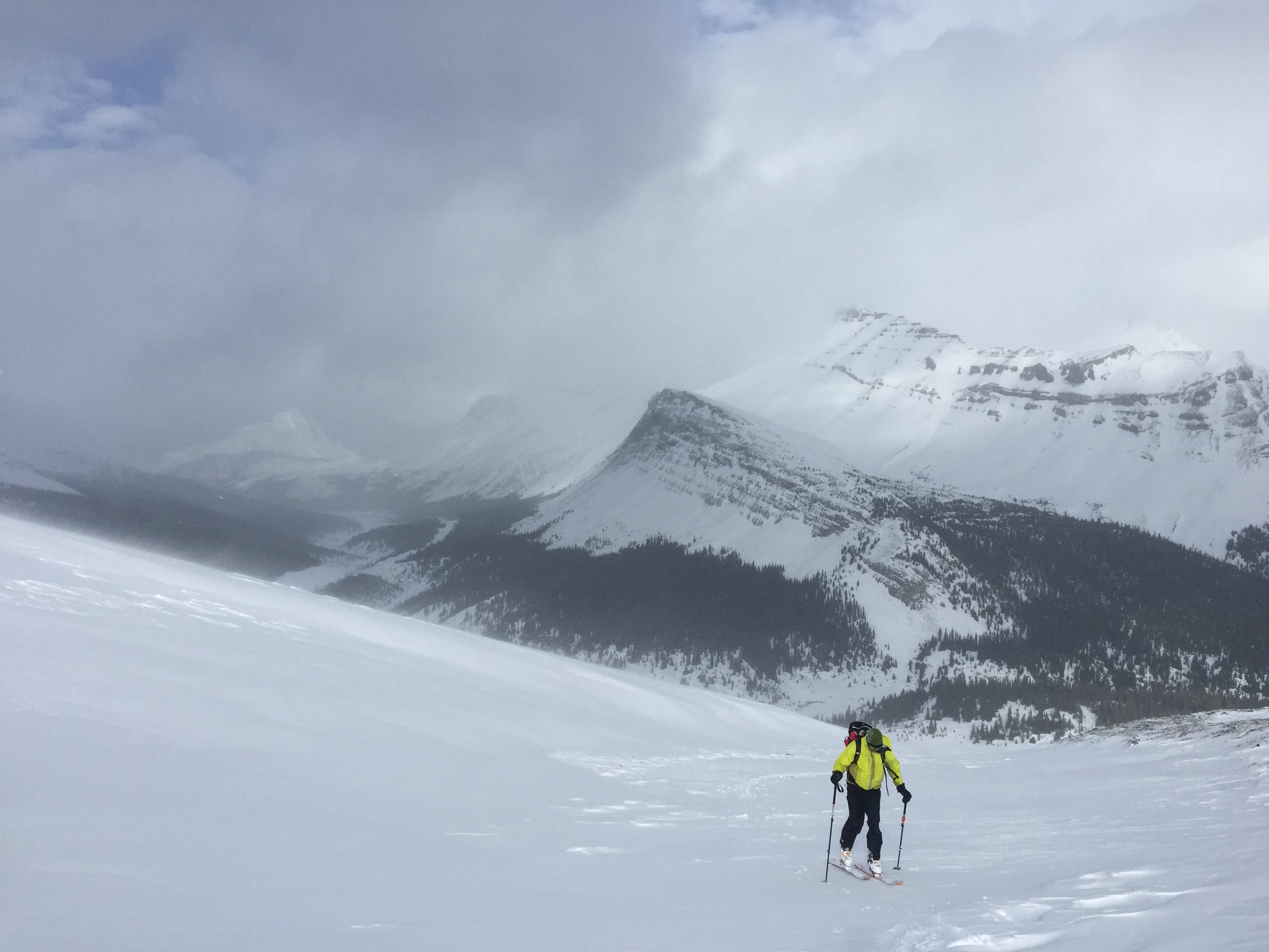 We route to the "summit" of Parker Ridge followed approximately the summer trail following a rib of low angle 25 degree terrain to the saddle. A logical more fall line descent from the summer trail saddle provided a good run and beta for yoyos. It was easy to avoid complex terrain and enjoy a great day in the Canadian Rockies. Great views of the Mount Willis, Big Bend. Athabasca, Saskatchewan Glacier.