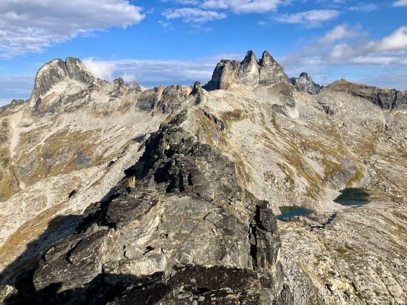 Perfect late summer alpine rock conditions in the Valhallas the past couple of days. We climbed a route on the Little South Face of Mt Gimli yesterday and scrambled up an unnamed peak today.