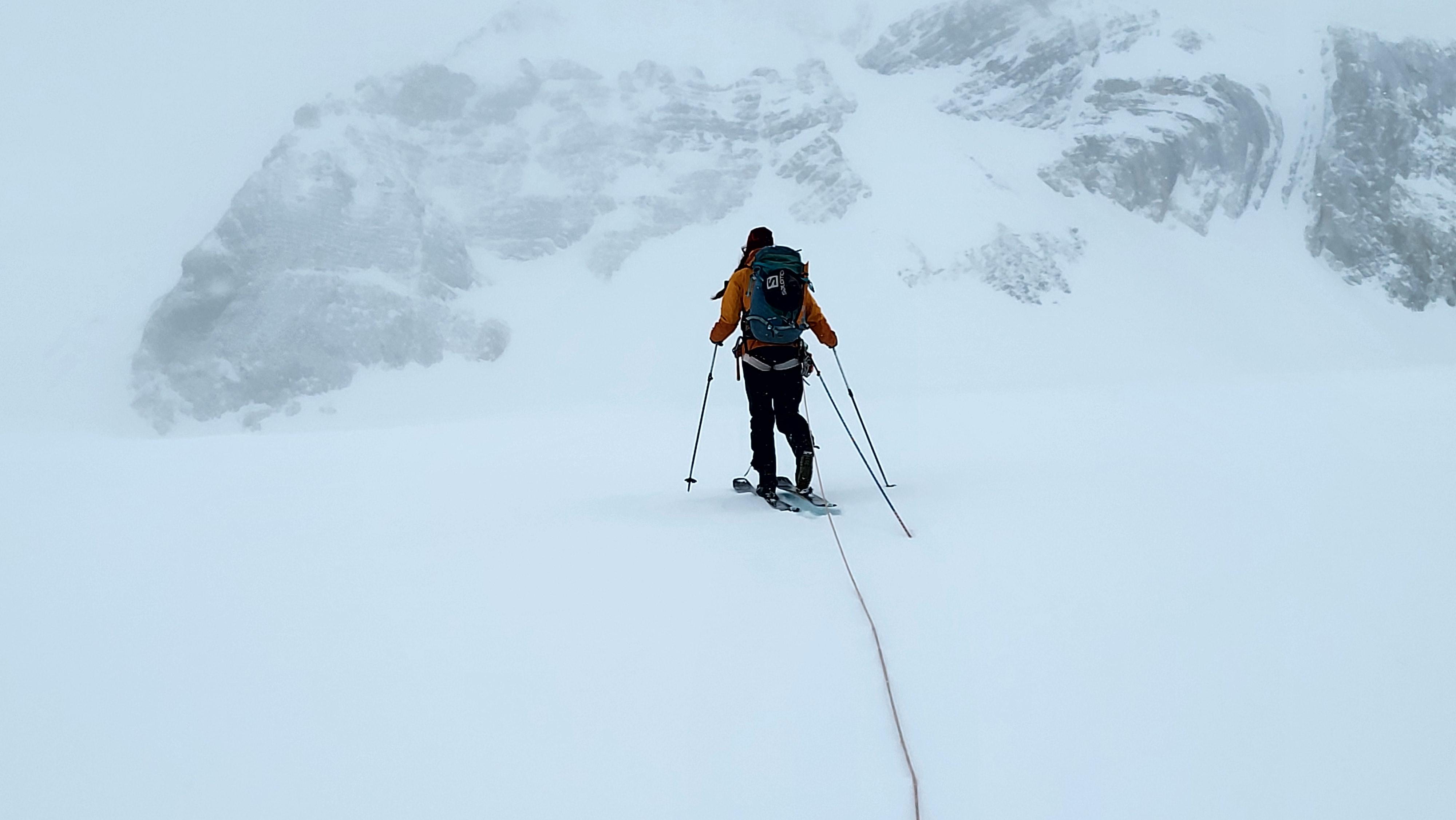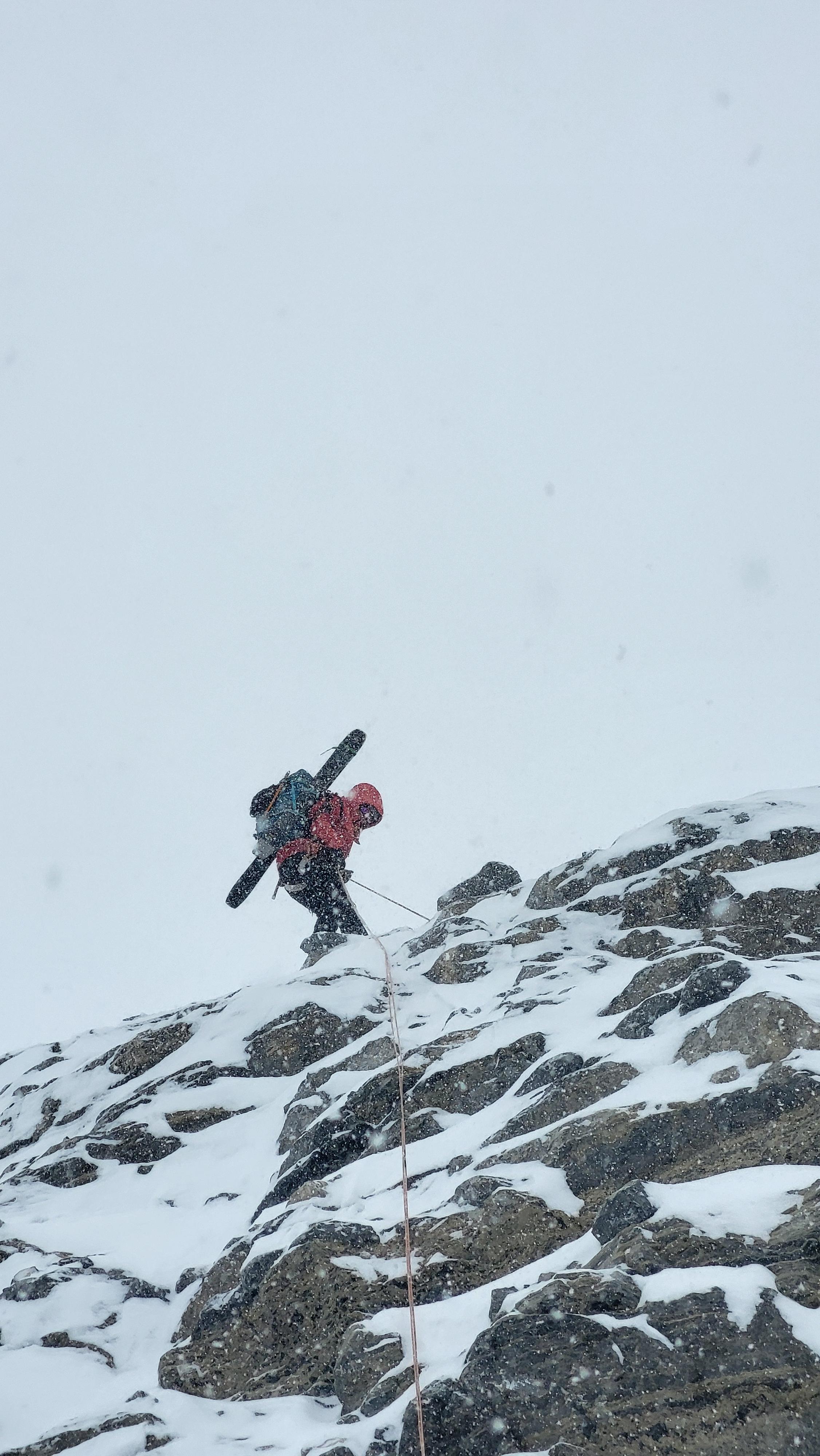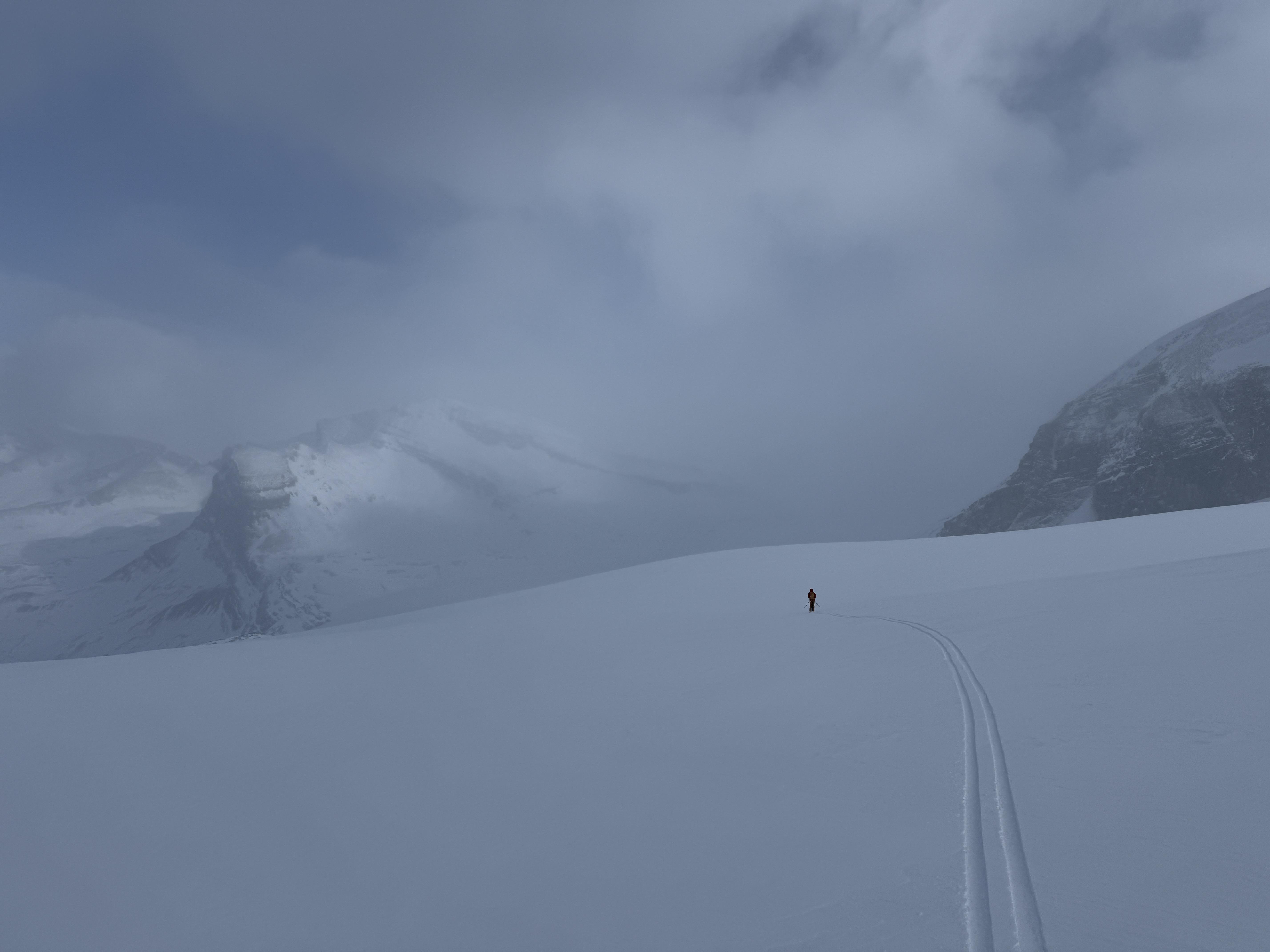 Glacier Travel - Probing across the Peyto Glacier, we measured 80cm to 280cm of snow with an average depth of 180cm. Surface conditions were firm, generally ski penetration was less than 10cm and ski crampons were useful for steeper slopes.