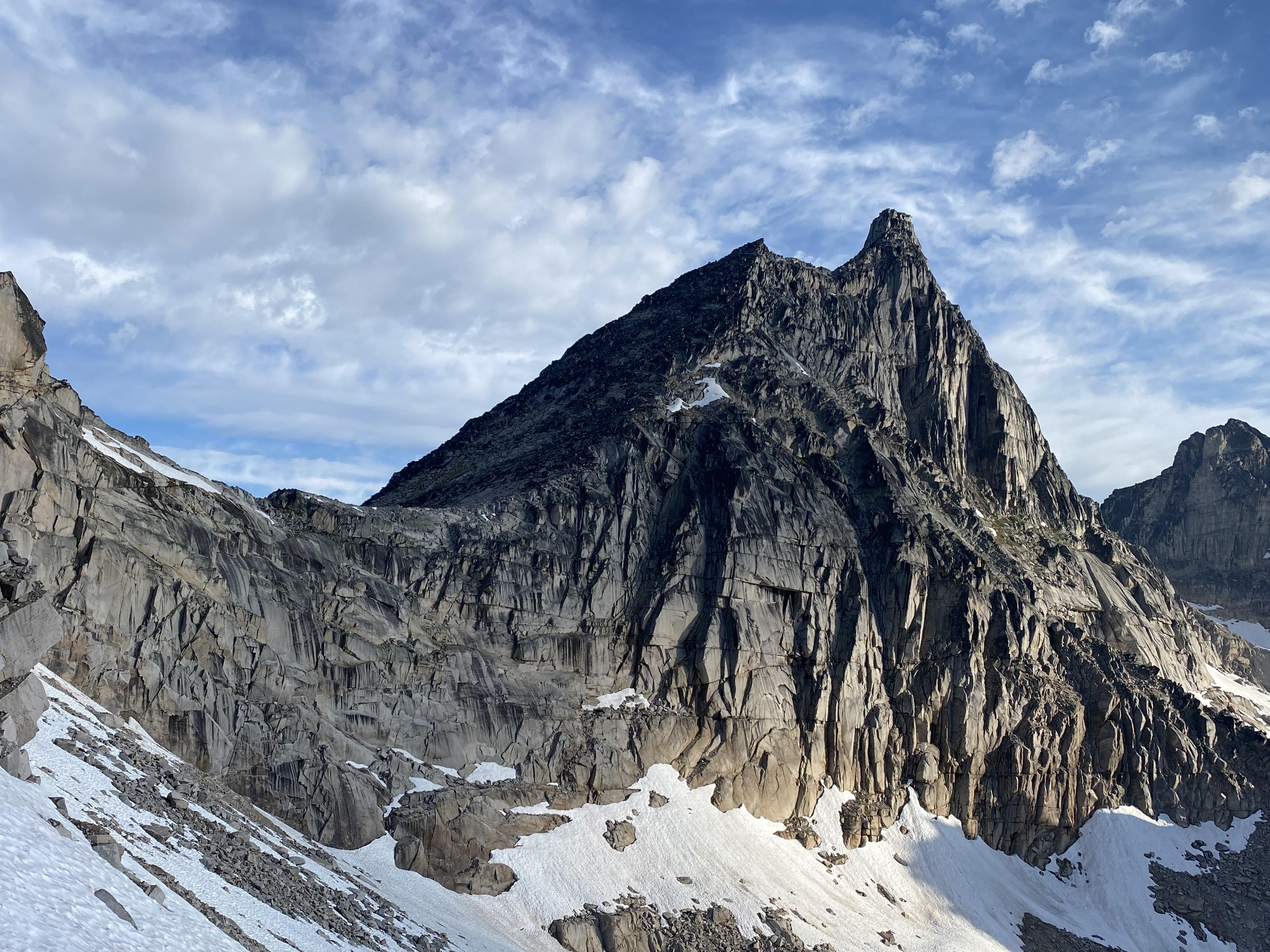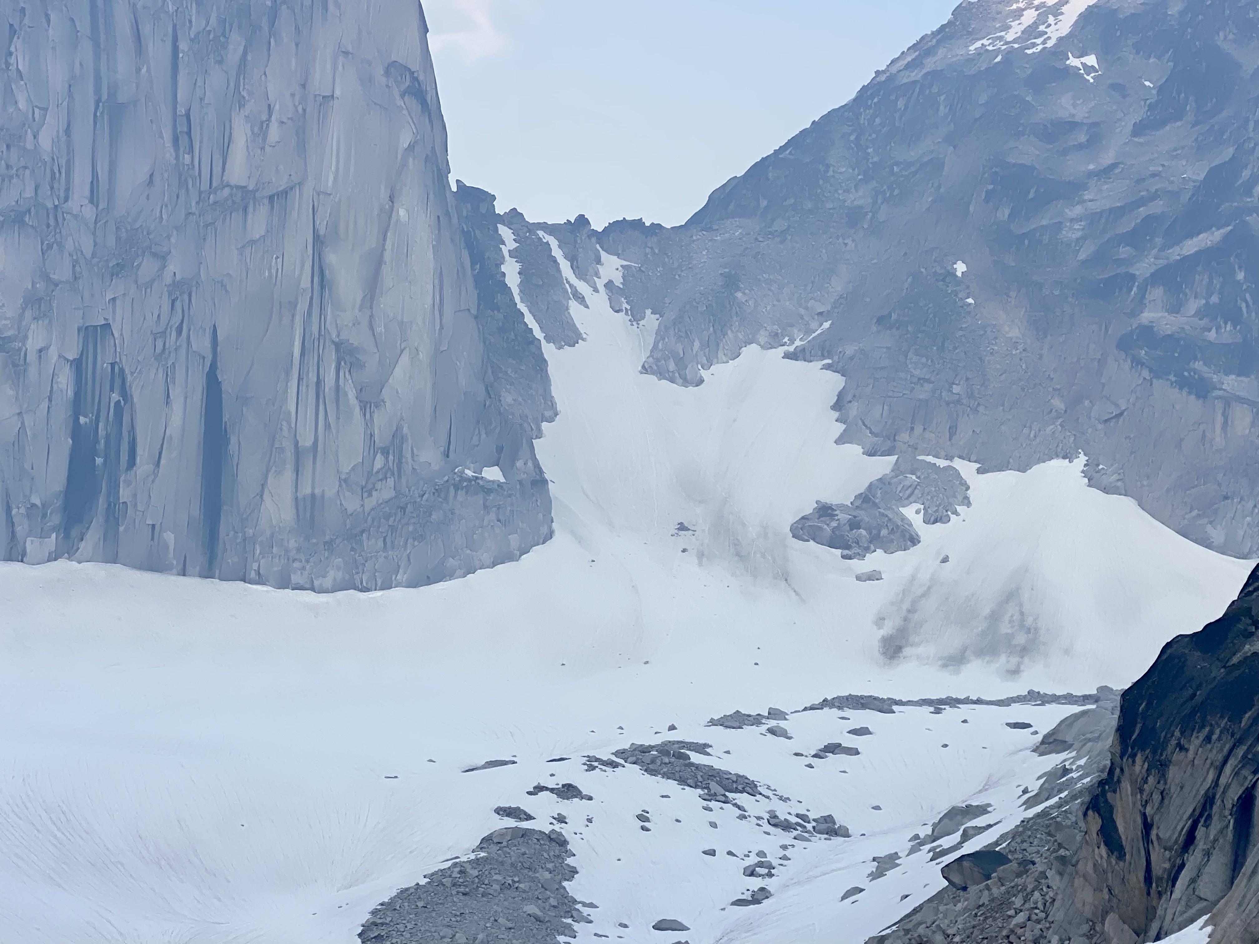 We did witness active rock fall out of the col between crescent spire and the crescent towers, as well as out of the climbers right side of the bugaboo-snowpatch col. Another active location for over head rock fall is the climbers right side of the bugaboo glacier a 100m above where you g access the glacier.