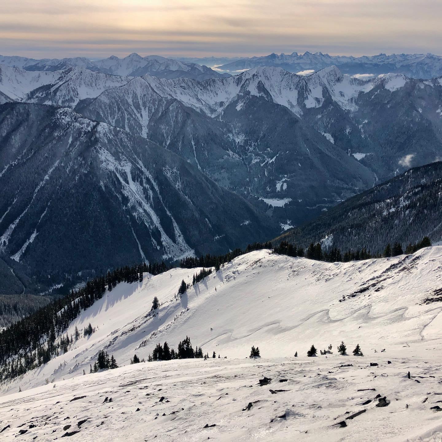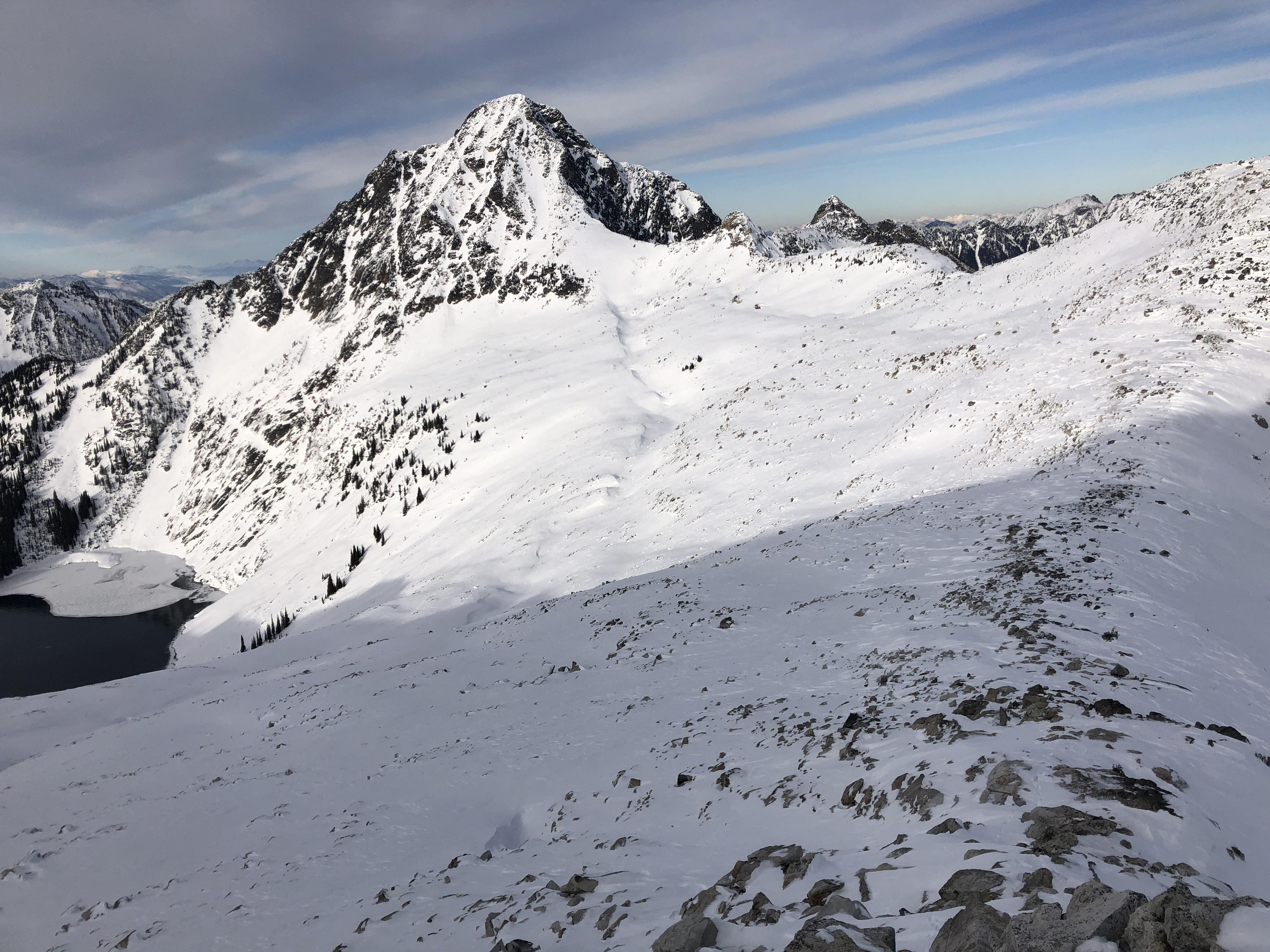 However, in the alpine and at treeline the height of snow exceeded the surface roughness in most start zones. There was a well preserved ice form rain crust 30 cm above the ground with pronounced facets above and below it above 1800m in most of the drainages I skied. The typical height of snow ranged from 40cm to 100cm in most alpine and treeline start zones. By November 21 the entire snowpack was faceted except for the aforementioned crust. It’s resistance ranged from fist to one finger minus in sheltered areas and in exposed areas ~5-10cm of pencil hard slab capped those facets. On steep solar aspects there were some melt freeze crusts mixed in, just to add a bit more spice.