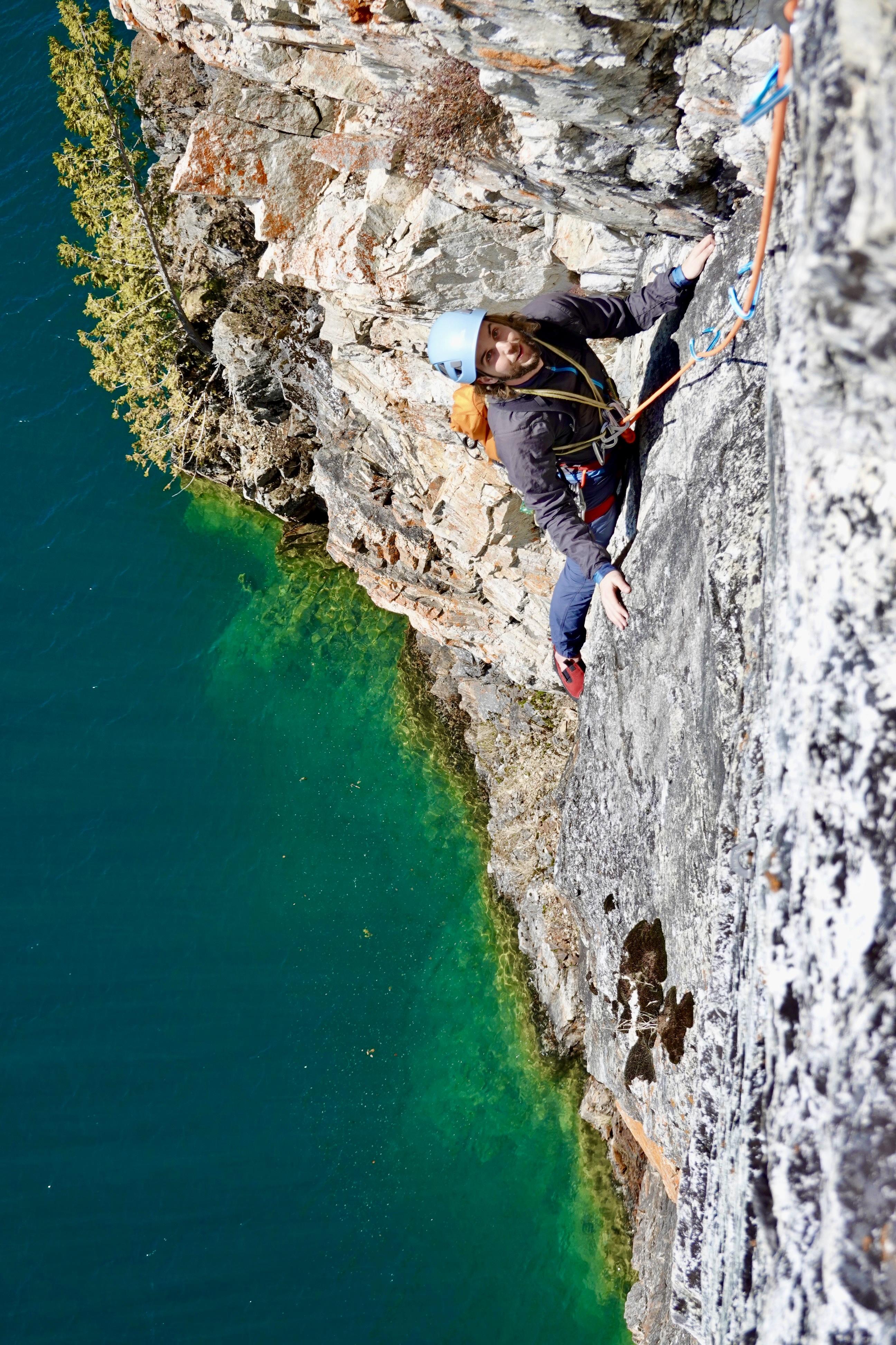 I climbed at the Voyage Wall at Waterworld this afternoon with a friend. The approach is snow covered and the fixed rope is mostly buried, making it easier to slip and fall off the top of the cliff than usual. The rock was mostly dry, although there were still some wet sections that made it a bit trickier than normal. I wore Long John’s but wished I hadn’t as I was hot. My fingers didn’t get cold at all.