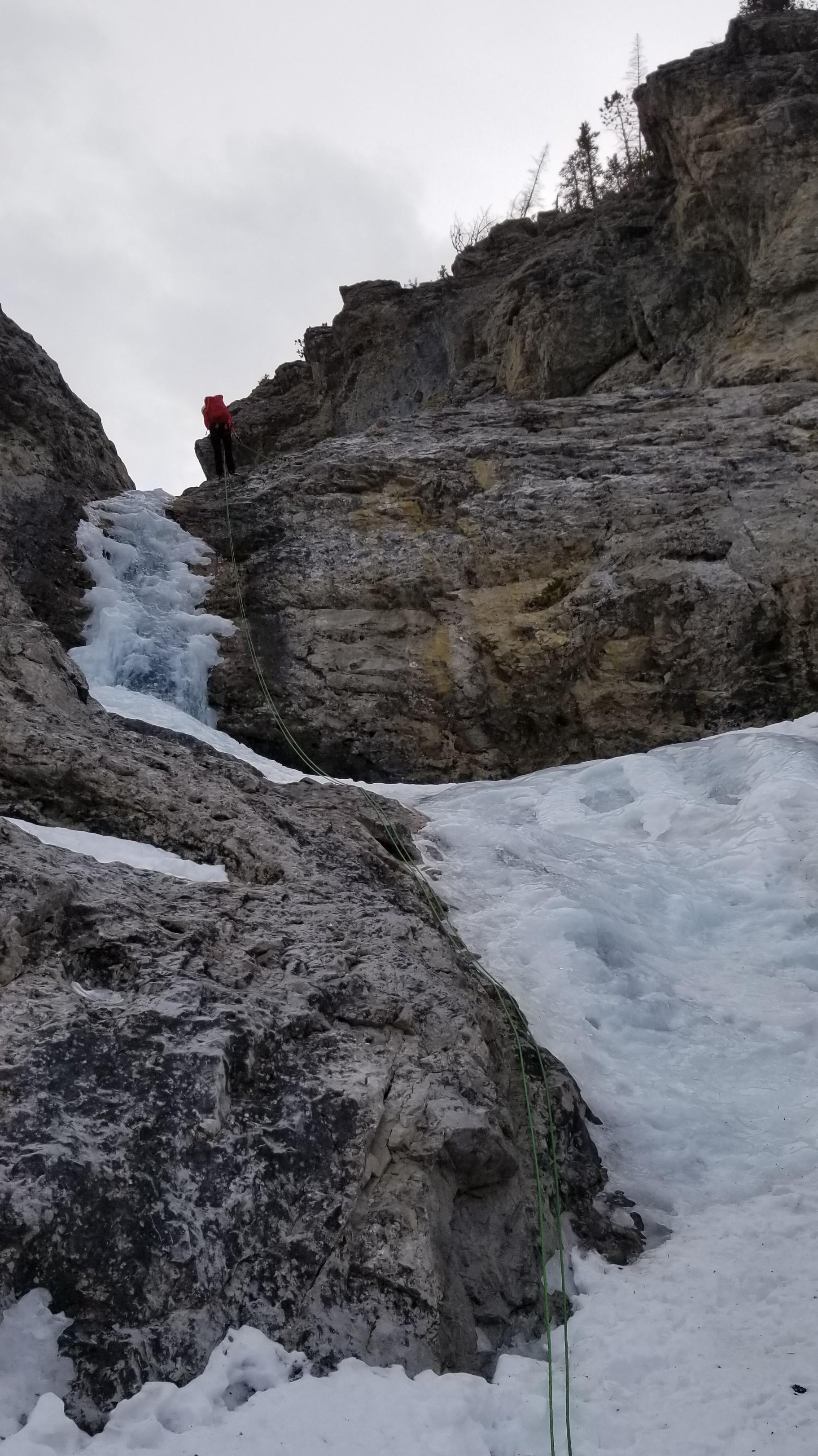 The final pitch is currently only about 10 m high with the other 20+ m covered by avalanche debris. It is also very thin at the top with water flowing under the ice so care was required. The new anchor at the top was appreciated because the traditional cave belay is covered with debris. All the needed rappel/belay stations were in good shape.