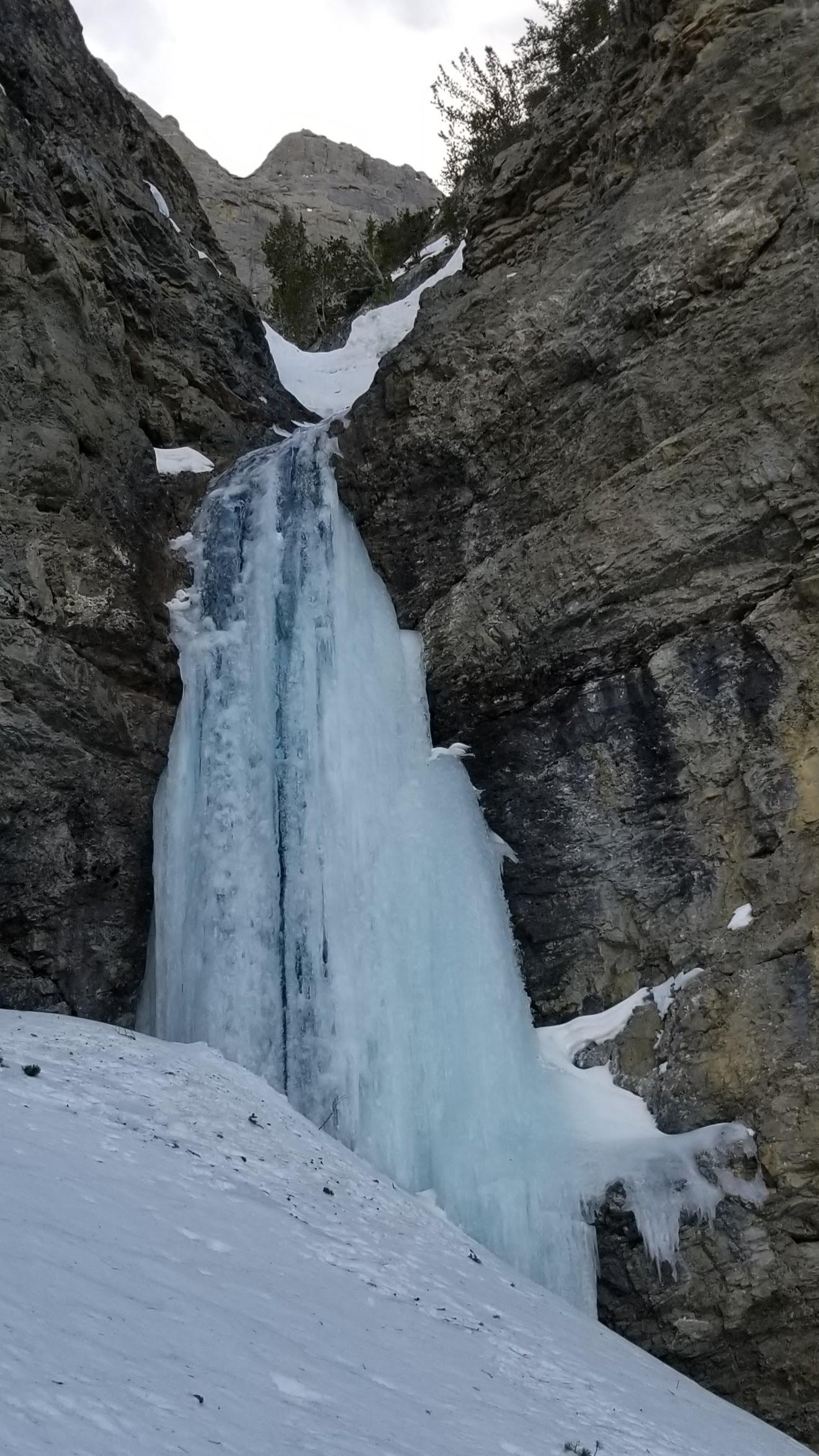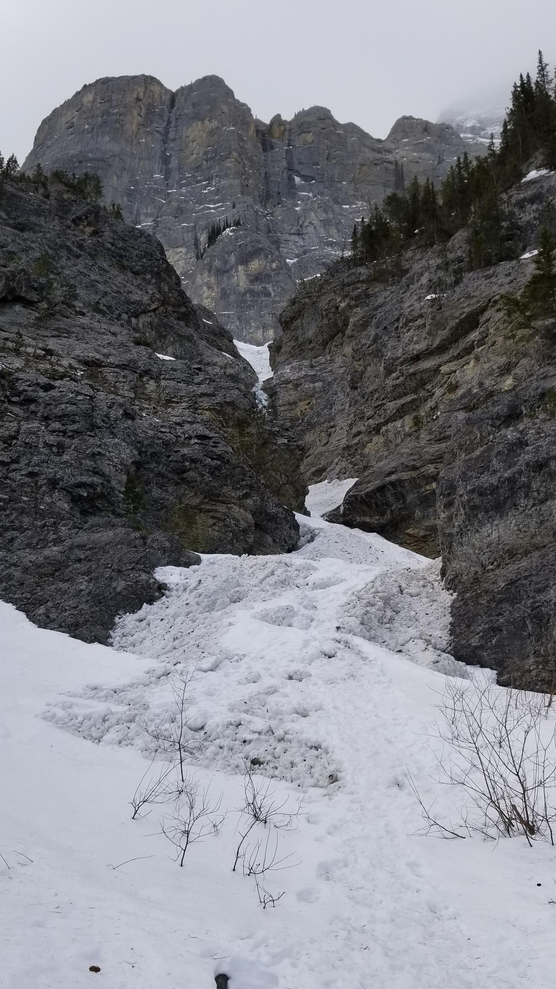 The lower angle ice sections above this are mostly walking on old avalanche debris as a result of several very large avalanches earlier in the season. The remaining step of ice in this section is not hard climbing, but has a very thin 1 cm thick top out with water running under it. Hopefully cooler temperatures help thicken this soon.