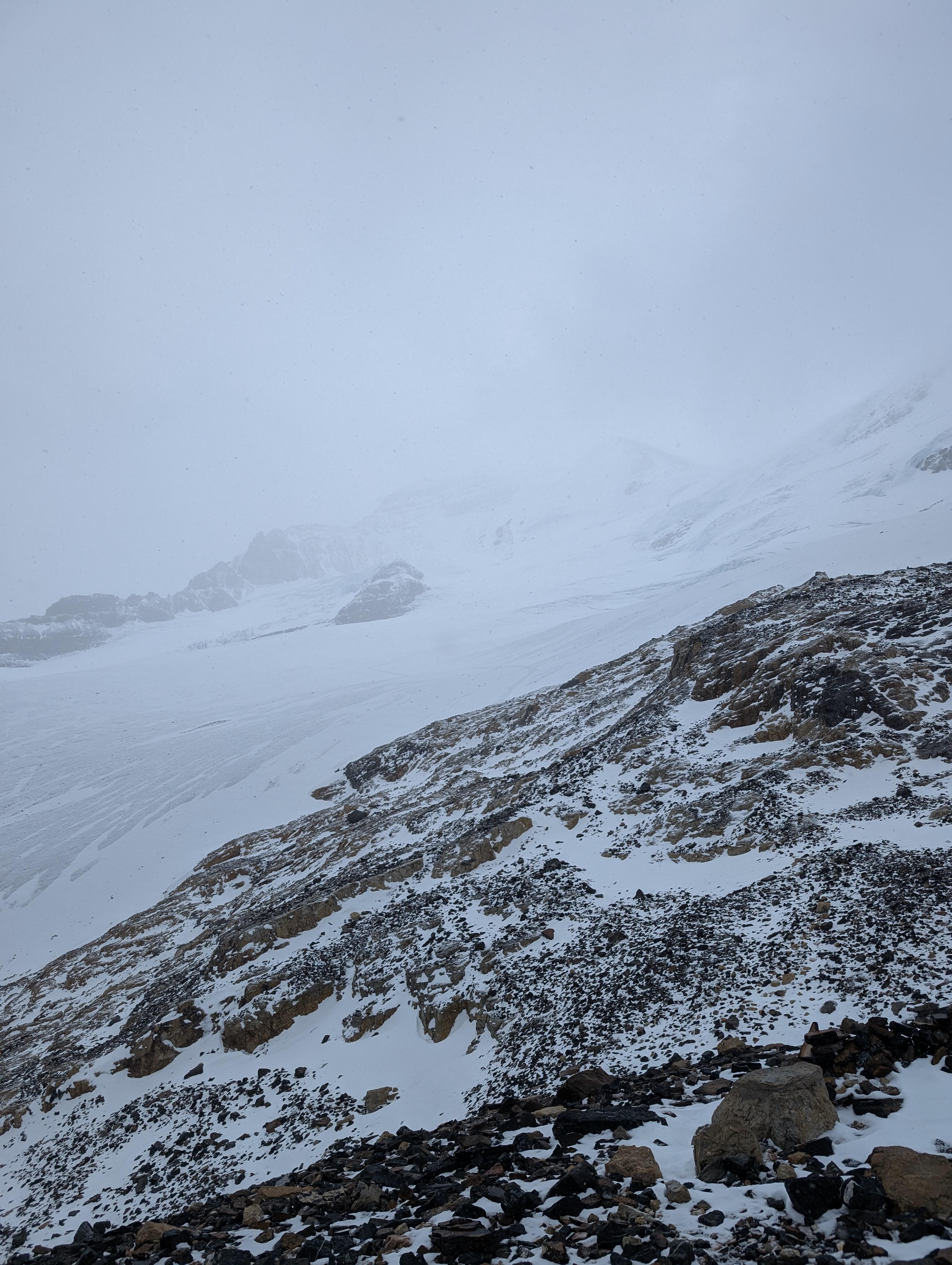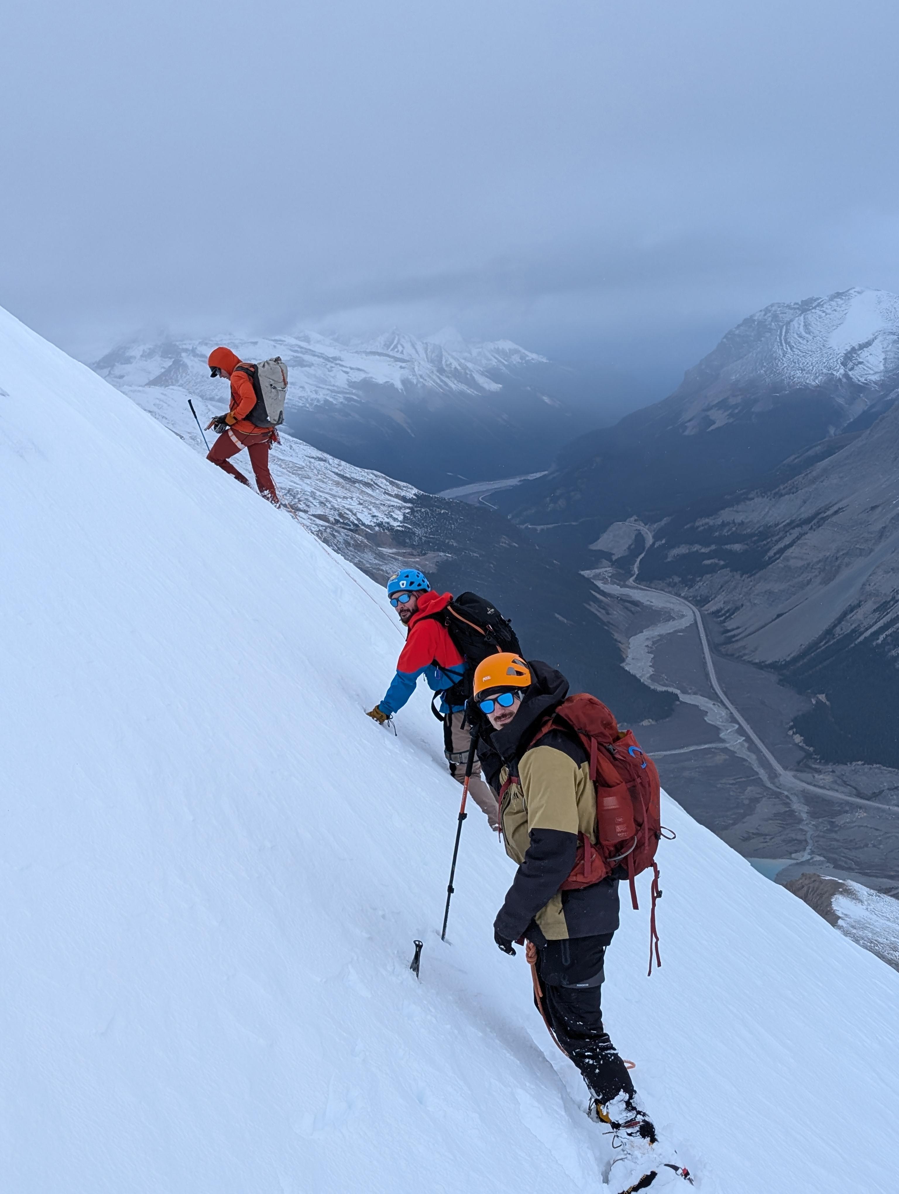 On the descent rapid snowfall began which had us reversing the ramp in up to a meter of heavy snow and considerable spindrift from the Silverthorn. We beat a hasty retreat.