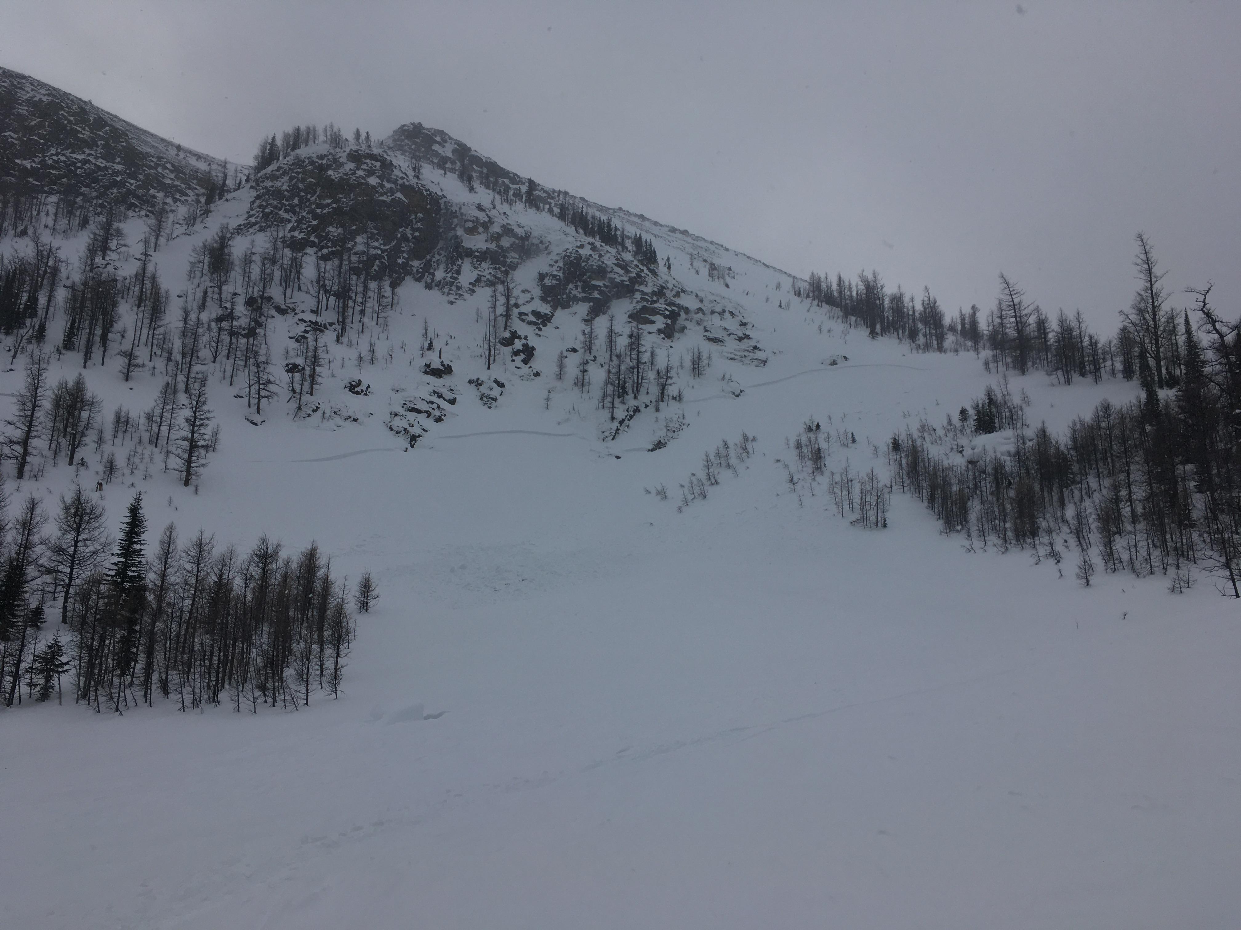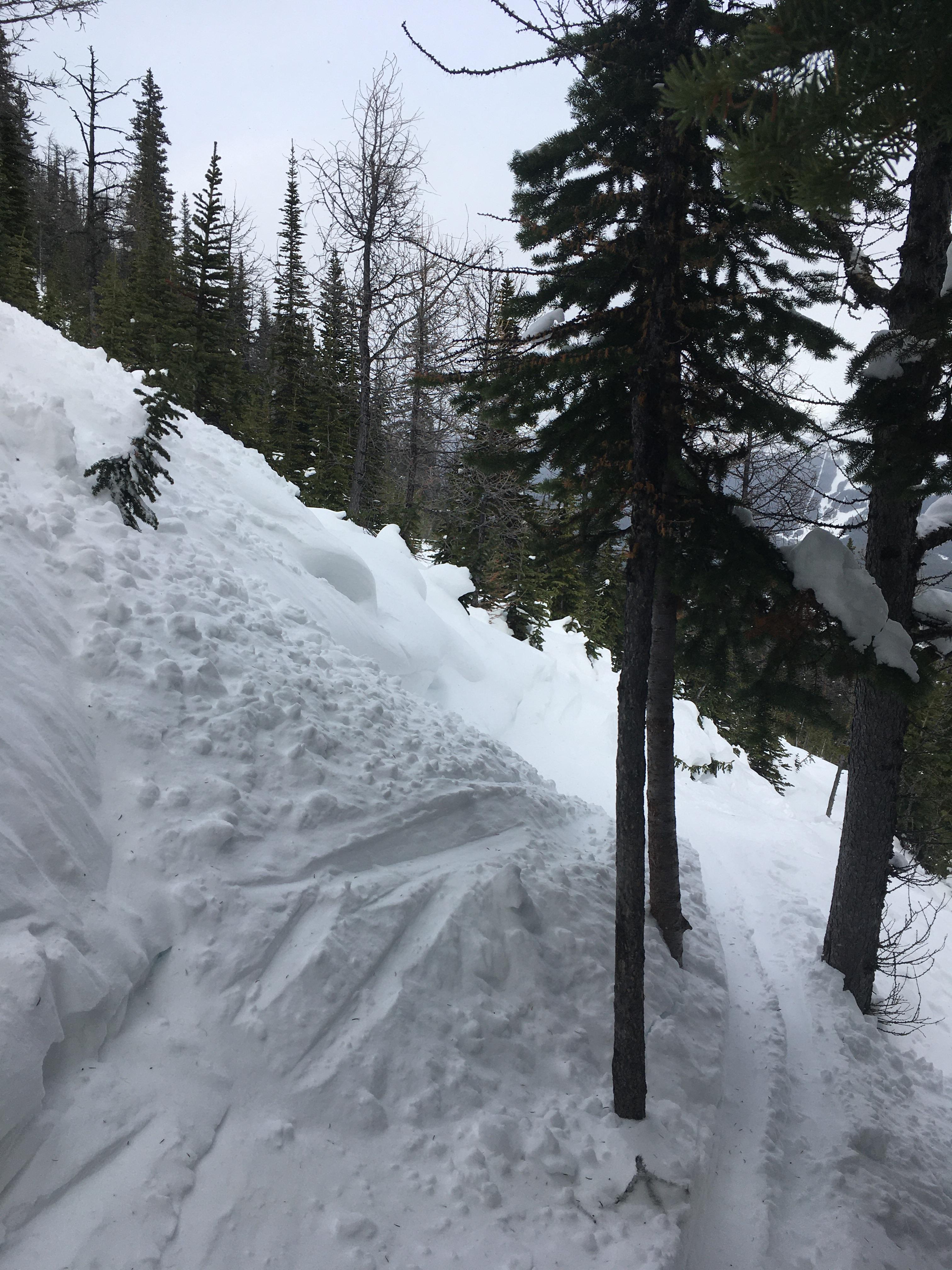 While out for a tour in the Surprise Pass area today, avalanche conditions changed rapidly. Leaving the parking lot around 9:00, temps were already warm (-4c) and winds were L-M Westerly down low and stronger up high. Walking up the standard trail through mature trees gave a false sense of conditions higher up. We managed the hazard by spacing out when needed but soon felt the full force of the near gale gusts as we emerged through treeline (gusts had the ability to knock a person over if not braced for it!). Realizing the rapidly deteriorating conditions, we pulled the pin on plan A, B and C and started our return slide down the trail. The trifecta of new snow/intense wind/warming temps to near zero was in full force. Upon our return, we noticed several size 1.5-2 avalanches, wind slab, from rapidly loaded pockets and gullies and warming temps. To our surprise, a couple of slides had debris covering our uptrack! Back at the parking lot (1750m), temps had risen to 3c and ridgetop winds were still howling. Ski sailing with a tarp across the lake sounded like a much better option!