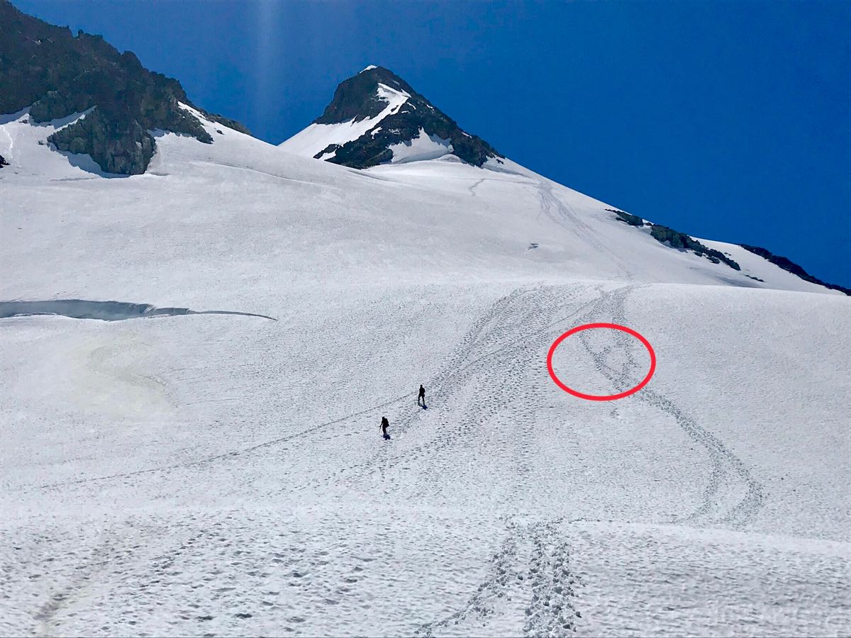 As has been noted in other MCR trip reports, the glaciers are changing quickly in the onslaught of hot temps. Typically there are obvious visual clues of crevasses this time of year and “trap door” events are rare. As we descended from Matier a member in our rope team did poke a leg through a hidden crevasse, shown circled in red on the picture. This was only a couple meters from the boot track and well away from the obvious adjacent slot. I just wanted to throw a heads up out there to be careful with conditions when the snow is this hot, especially in the afternoons.