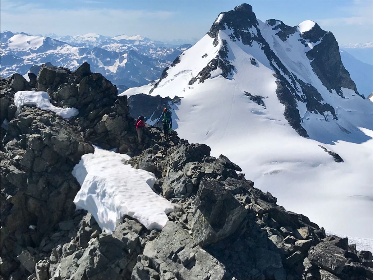 As a side note, we climbed Joffre’s E. Ridge the following day and descended the S. Buttress via rappels. We noticed a lot of “off route” rappel stations, some of which were quite sketchy looking. The established piton anchor had no cord on it anymore so we rebuilt the station. We had two ropes which reached the glacier (hard to pull) so did not see the other stations. It would be good for us to all utilize the same rappels vs. leaving tat all over the mountain and/or rapping into the heinously loose gullies where rockfall could inflict injury to rope or climber.
