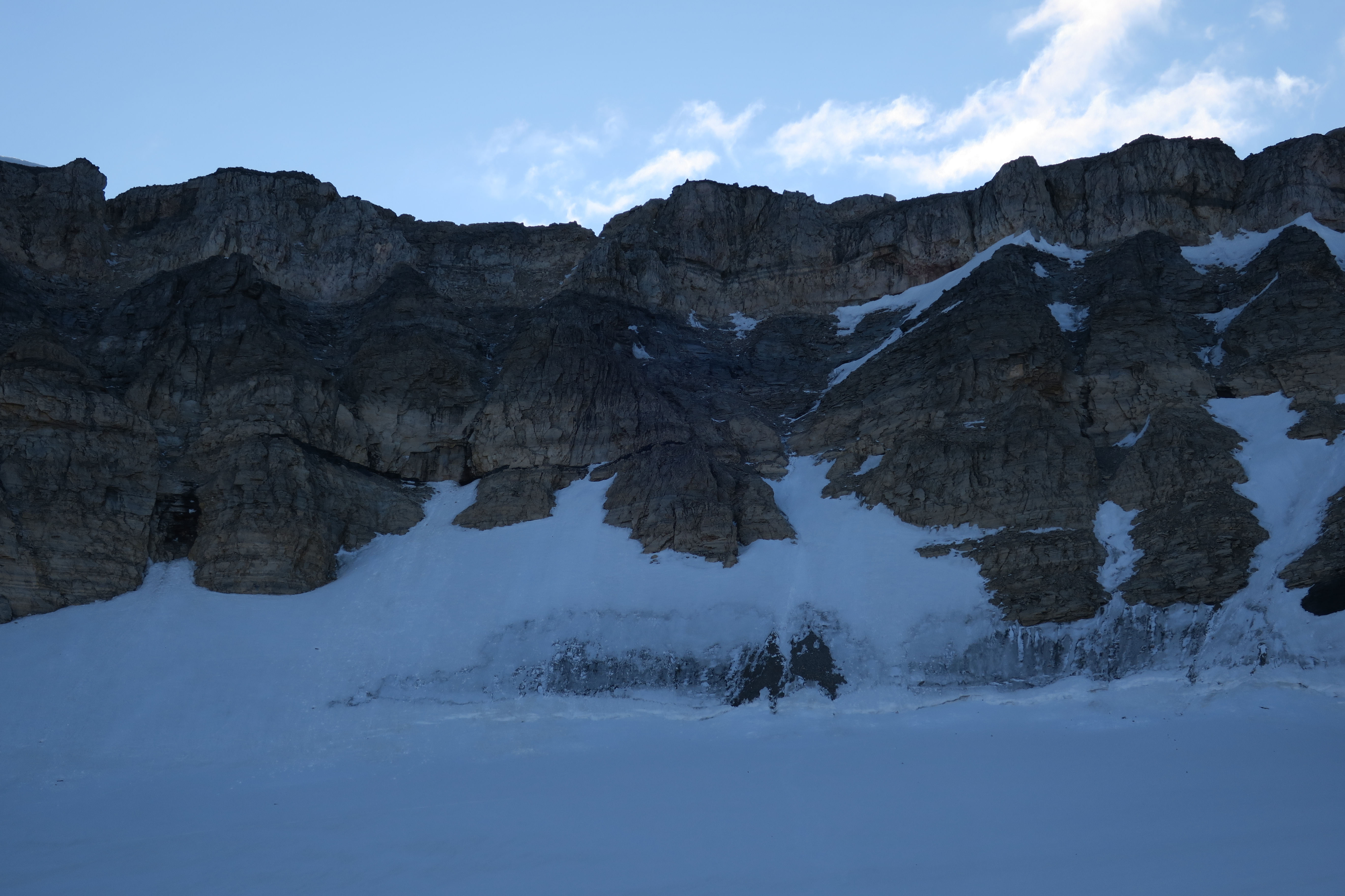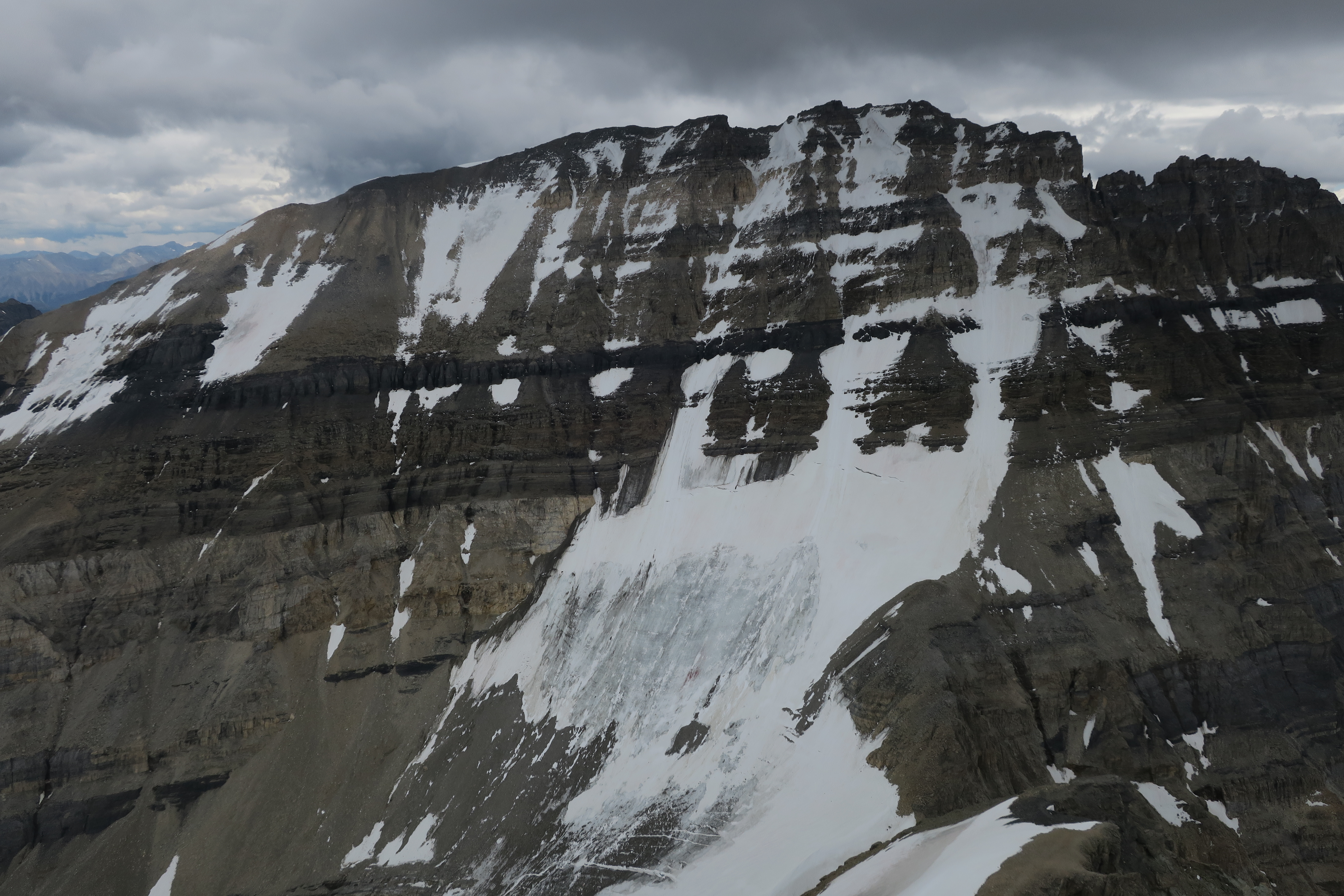 A Parks Canada Visitor Safety team climbed the Huber Ledges to the SW face of Mt Victoria, before descending the SE Ridge to Abbot Pass on July 23, 2018. The Huber Glacier is still well covered, with an simple schrund crossing to access the SW face of Mt Victoria. A bit of ice starting to show above the schrund and an easy ice anchor for the crossing.
