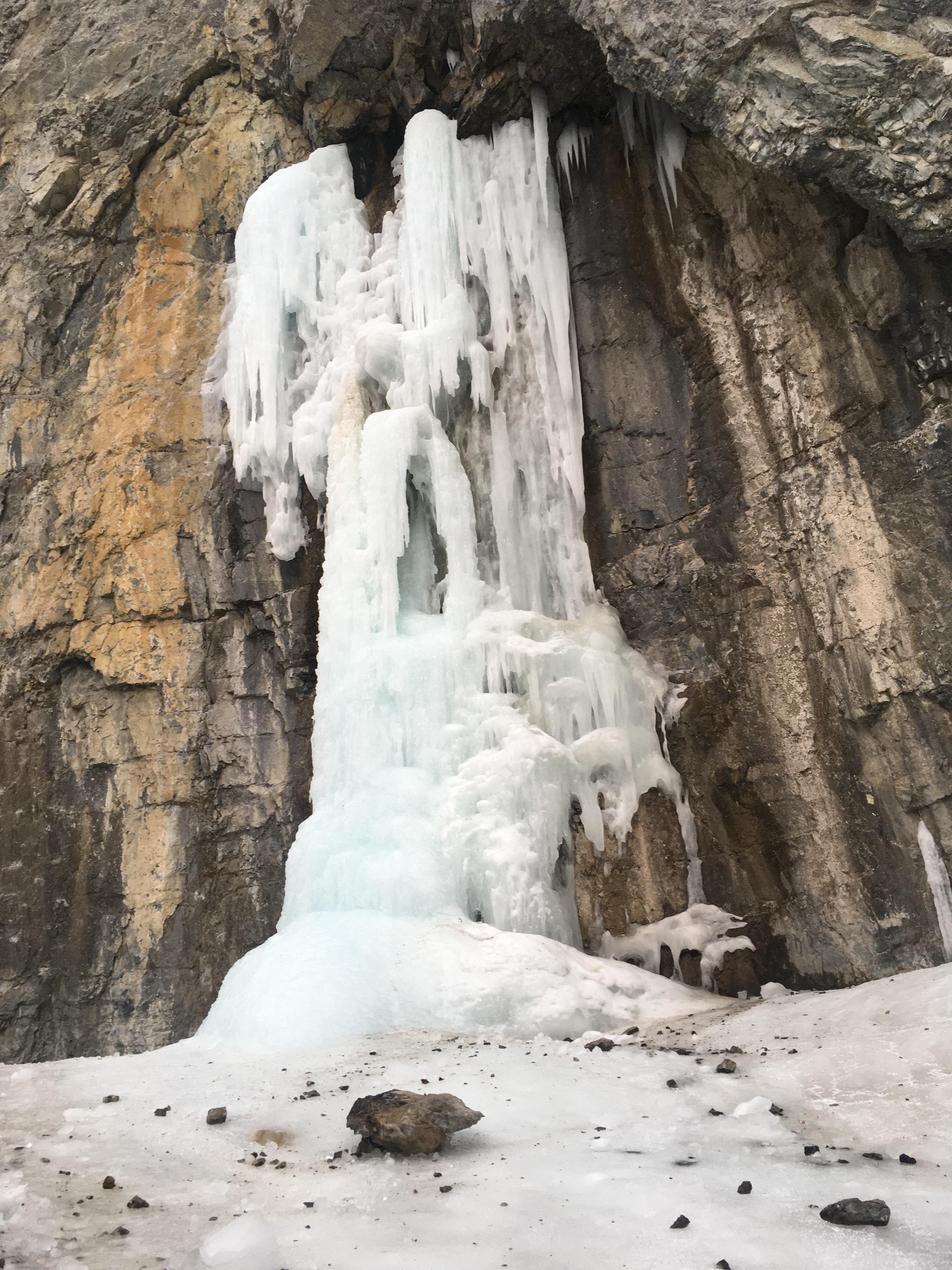 Lots of evidence of recent rock fall from the loose, chossy roof from which the ice climb known as "Hers" seeps, including one particularly large microwave-sized block laying on the ground at its base (see photo). I did not witness this rockfall event, but it is clear that it was fairly new; most likely in the past 24 hours with the very warm temperatures that we are currently experiencing (above zero Celsius). This roof that overhangs "Hers" has become notorious in the past year for shedding. Last winter in mid-March (2020), I witnessed a toaster-sized rock fall from the roof on a warm day and hit a climber in the arm while they were climbing. It would be best to avoid climbing "Hers" until cold temperatures freeze the rock in place, and still be super aware and ready to bail if the temperature increases or when the midday sun hits the route.