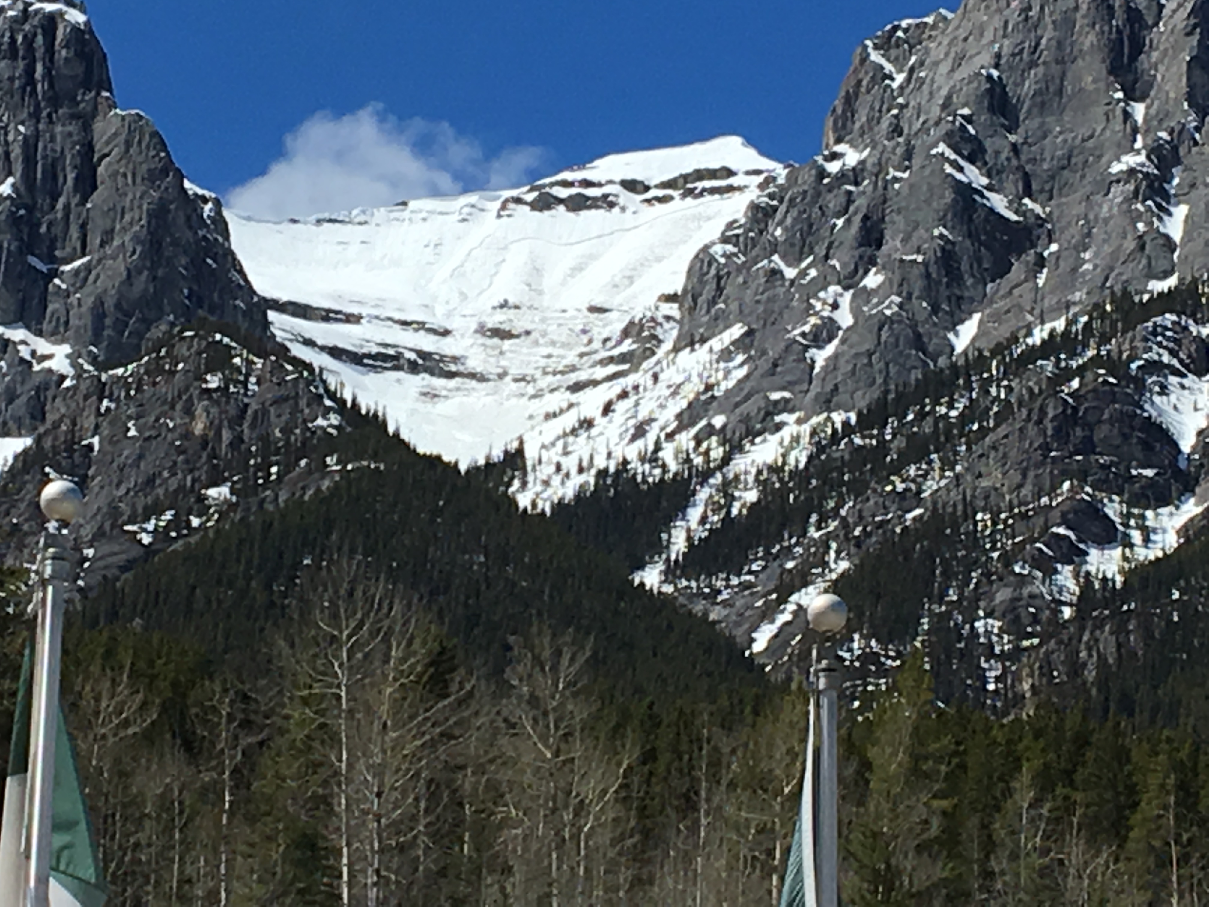 Today (Thursday, May 4) brought the dramatic change in temperatures that was promised in the forecast. The overcast skies in the morning kept temperatures warm overnight and the eventual clearing saw temperatures spike into the 20 degree range. By noon this brought about a major change in the snow stability. In addition to the inevitable snowballing, and loose wet surface avalanches, the lurking weakness came alive. From my perch at the Bill Warren Training Centre I saw significant slab avalanches on Mount Rundle and elsewhere on sun exposed slopes. The pictures tell the story of what it looks like out there.