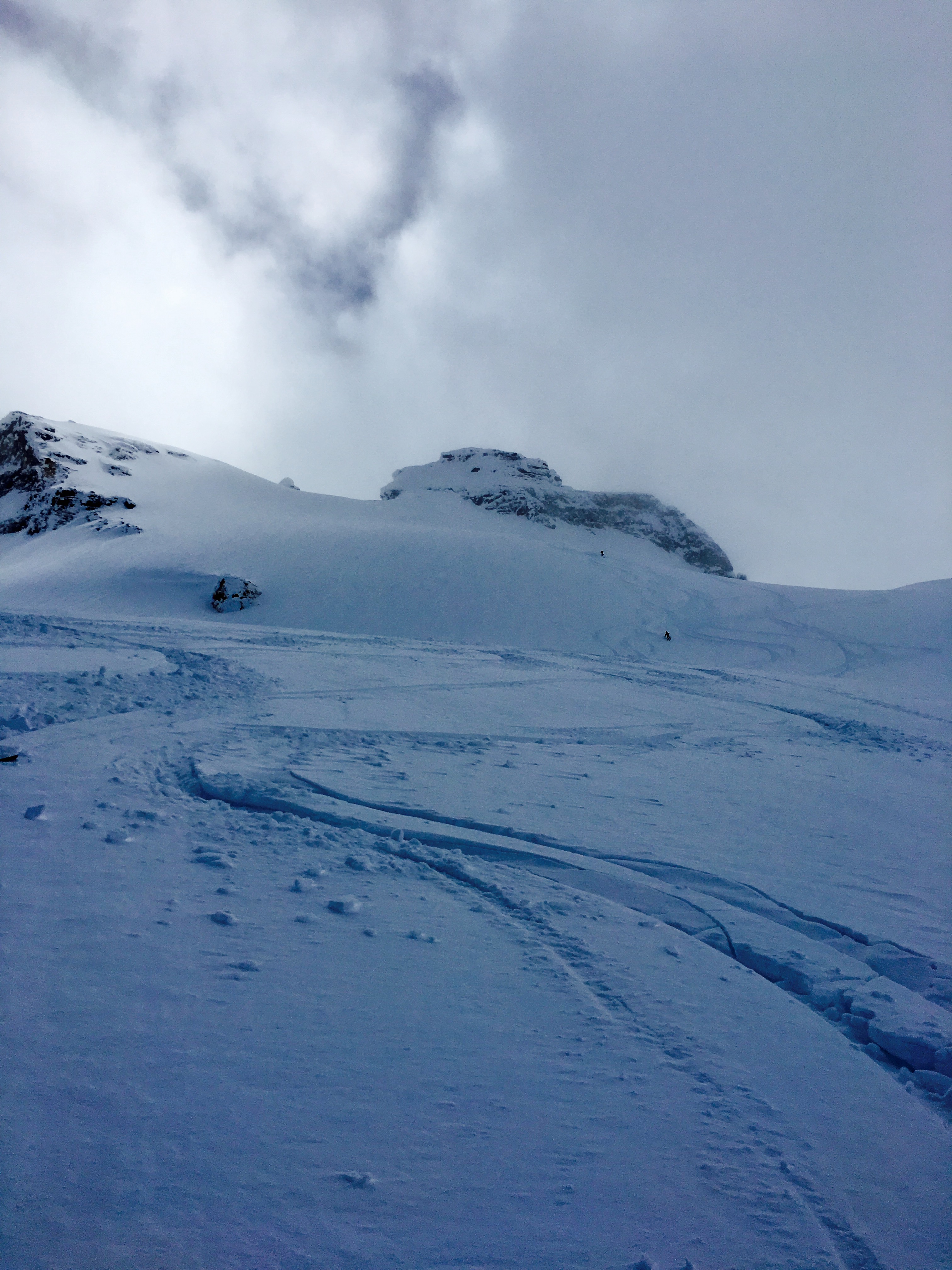 Temps dropped to -10 up higher with 10-20cm of new snow. 300+cm on the glacier and still some open crevasses center and climbers right.