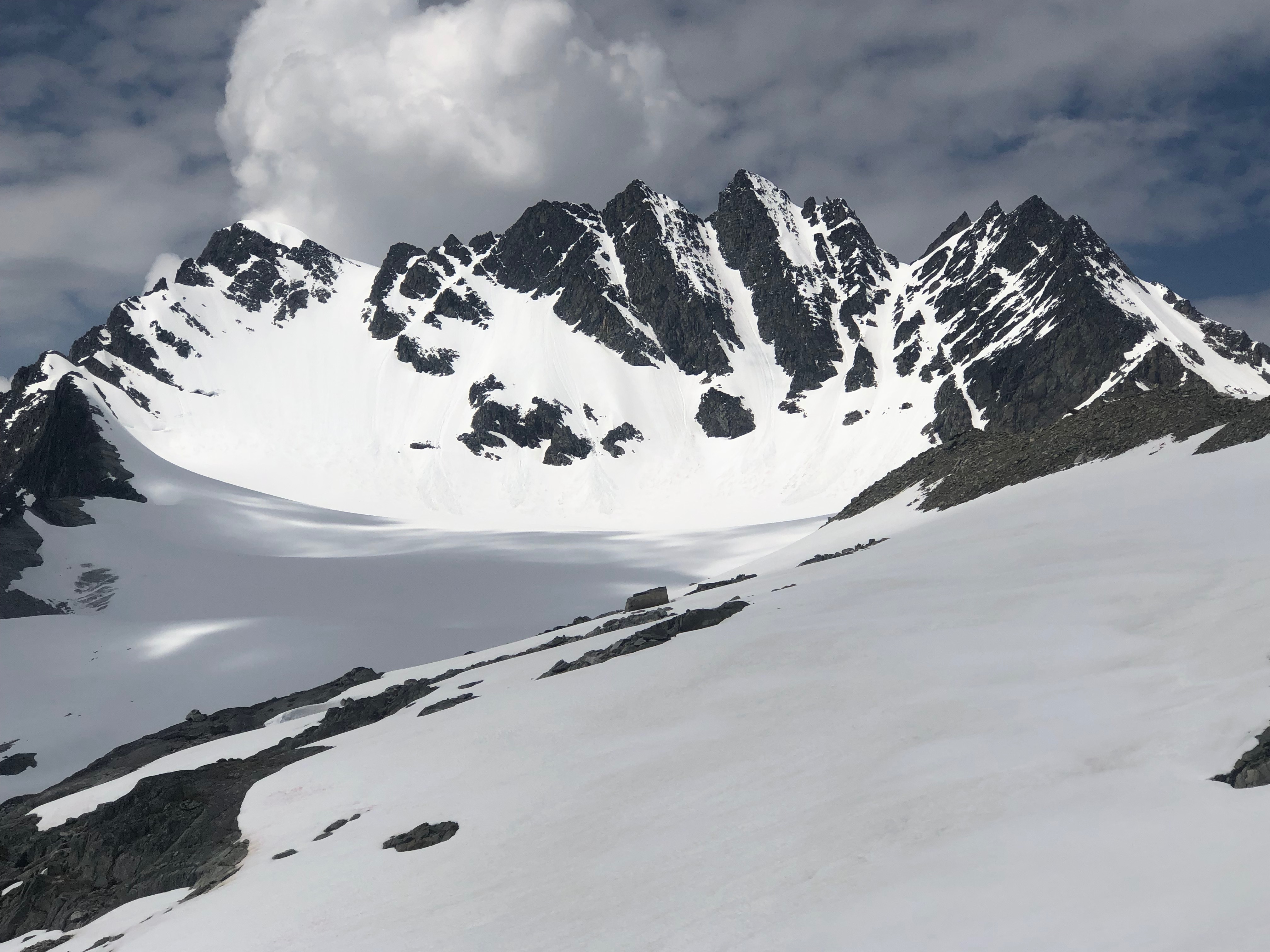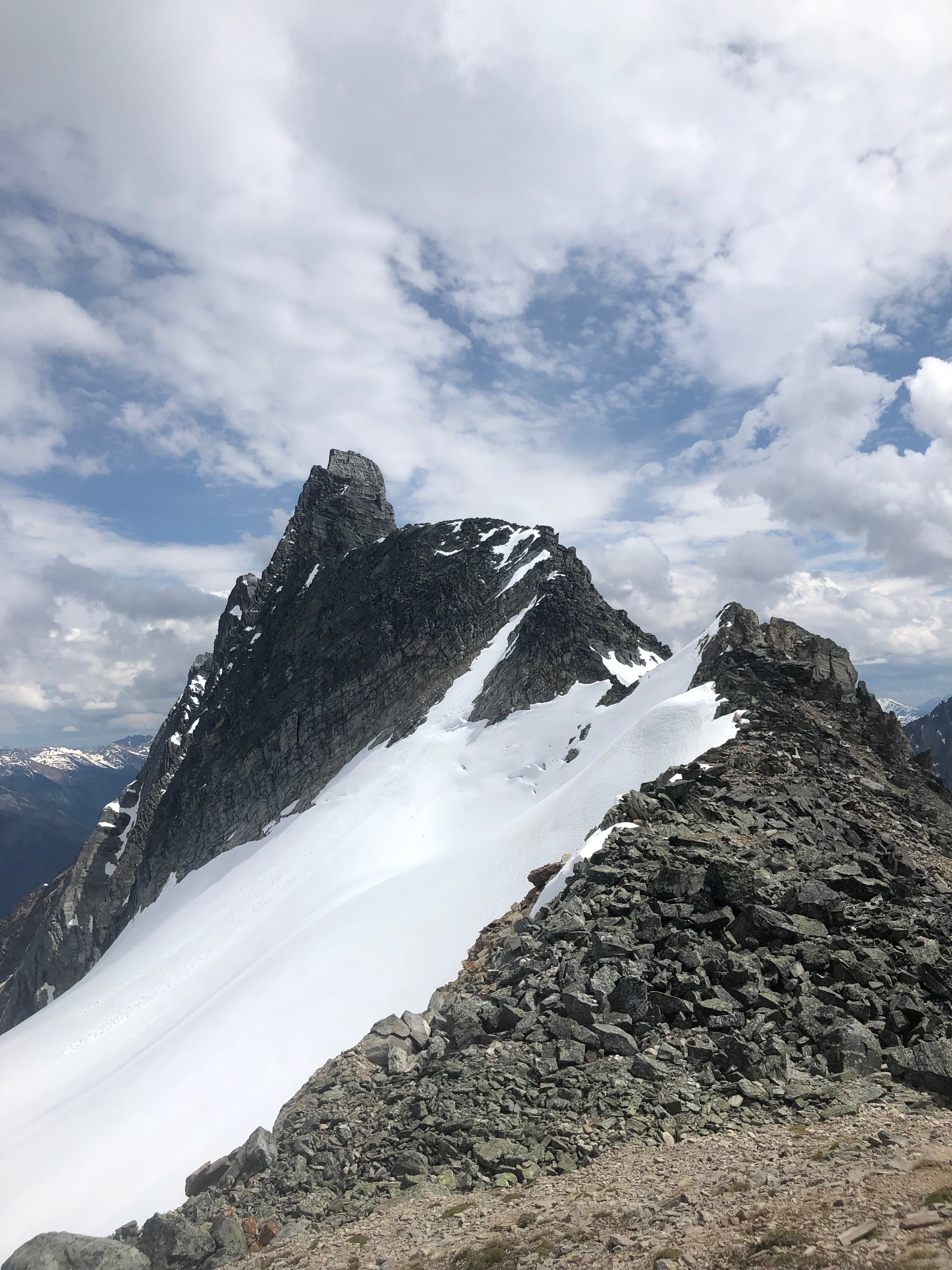Spent the day on Mount Tupper. Rogers Pass is still transitioning from winter to summer (about a month behind average years) in the mountains with heavy snow cover above 2000m. Hermit campground was fully covered with up to 2m of snow. Entirely snow travel from campground to Tupper West Ridge. Tupper West ridge is snow free and dry. Still lots of snow in Lone Pine.