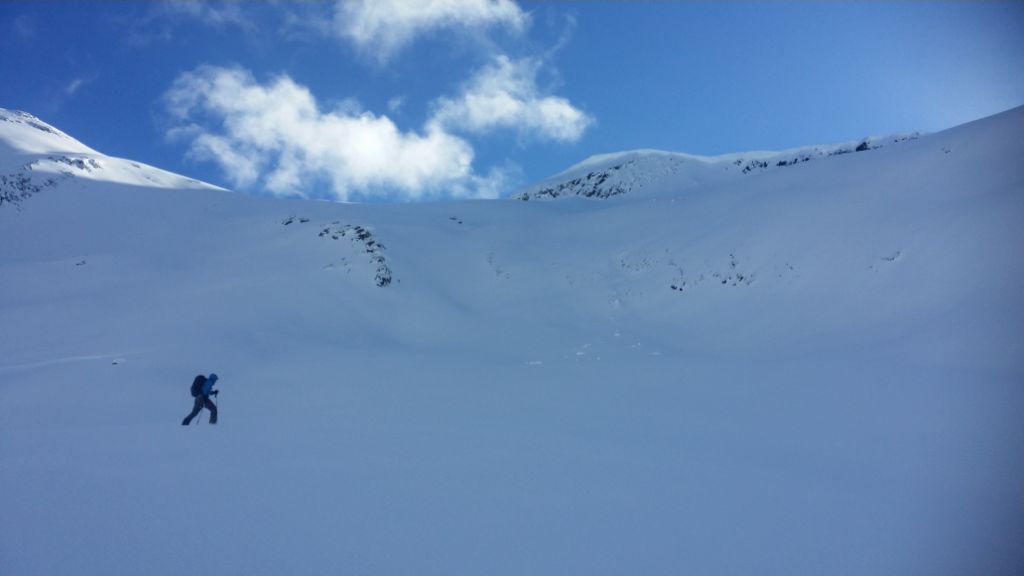 Once in the open terrain we found 10-15cms of new snow over a previous temperature crust that was supportive, yet soft enough to edge when tracksetting in the steep lower part of the path. This was only present up to the 1200m. elevation after which things softened right up allowing for 30-40cms ski penetration in soft (Fist) snow that was overlying a previous windslab that seemed well settled and bonded.
