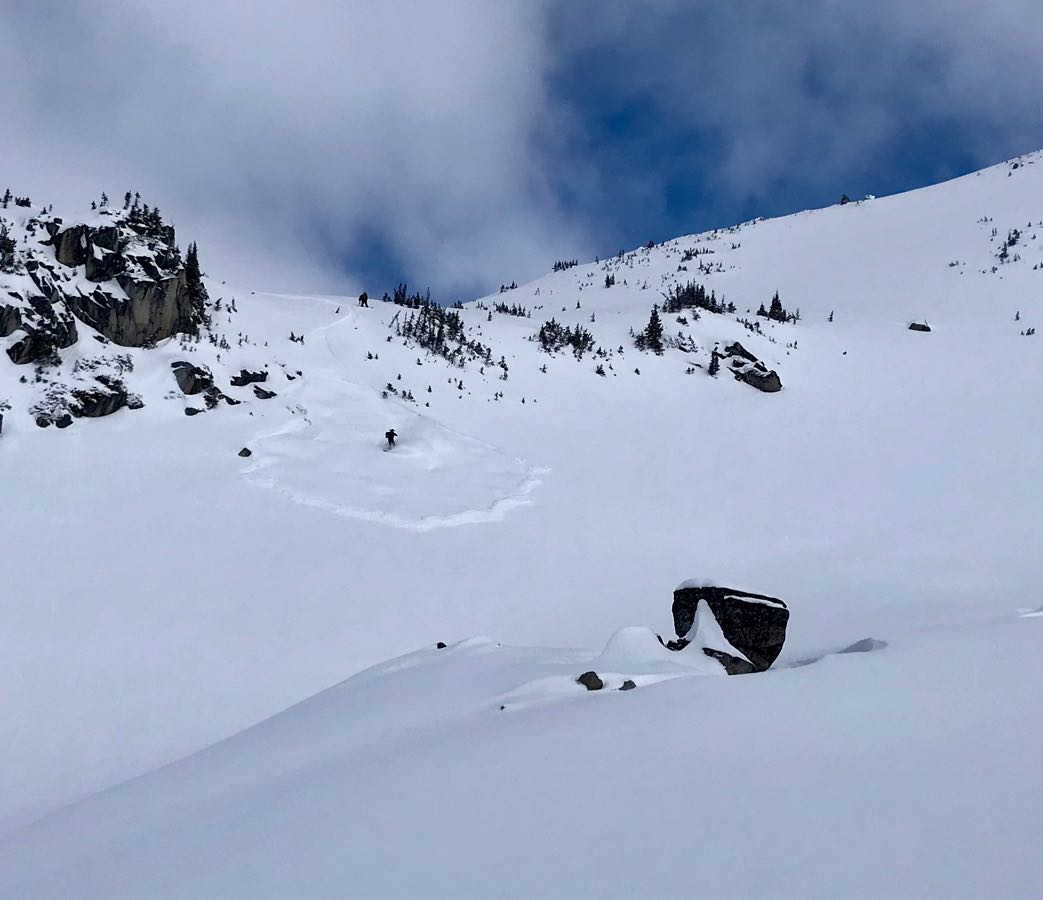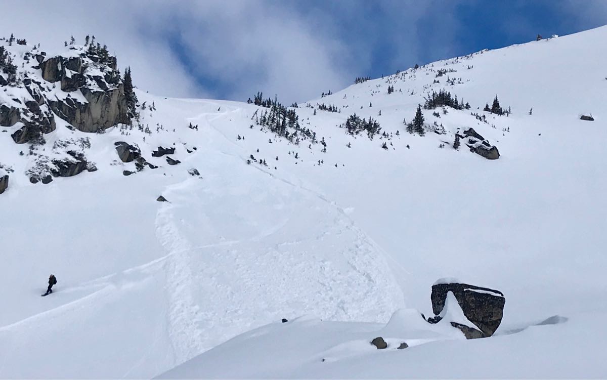 One of our group triggered a small avalanche on a steep and rocky S-facing slope at upper treeline elevation yesterday. The slab was approximately 15m wide x 15m long x 30cm deep. It released sluggishly and allowed the rider to get to the side easily. Presumably the bed surface was a buried suncrust, given the steepness and aspect of this slope. While this was a small avalanche it’s indicative of the potential in bigger terrain.