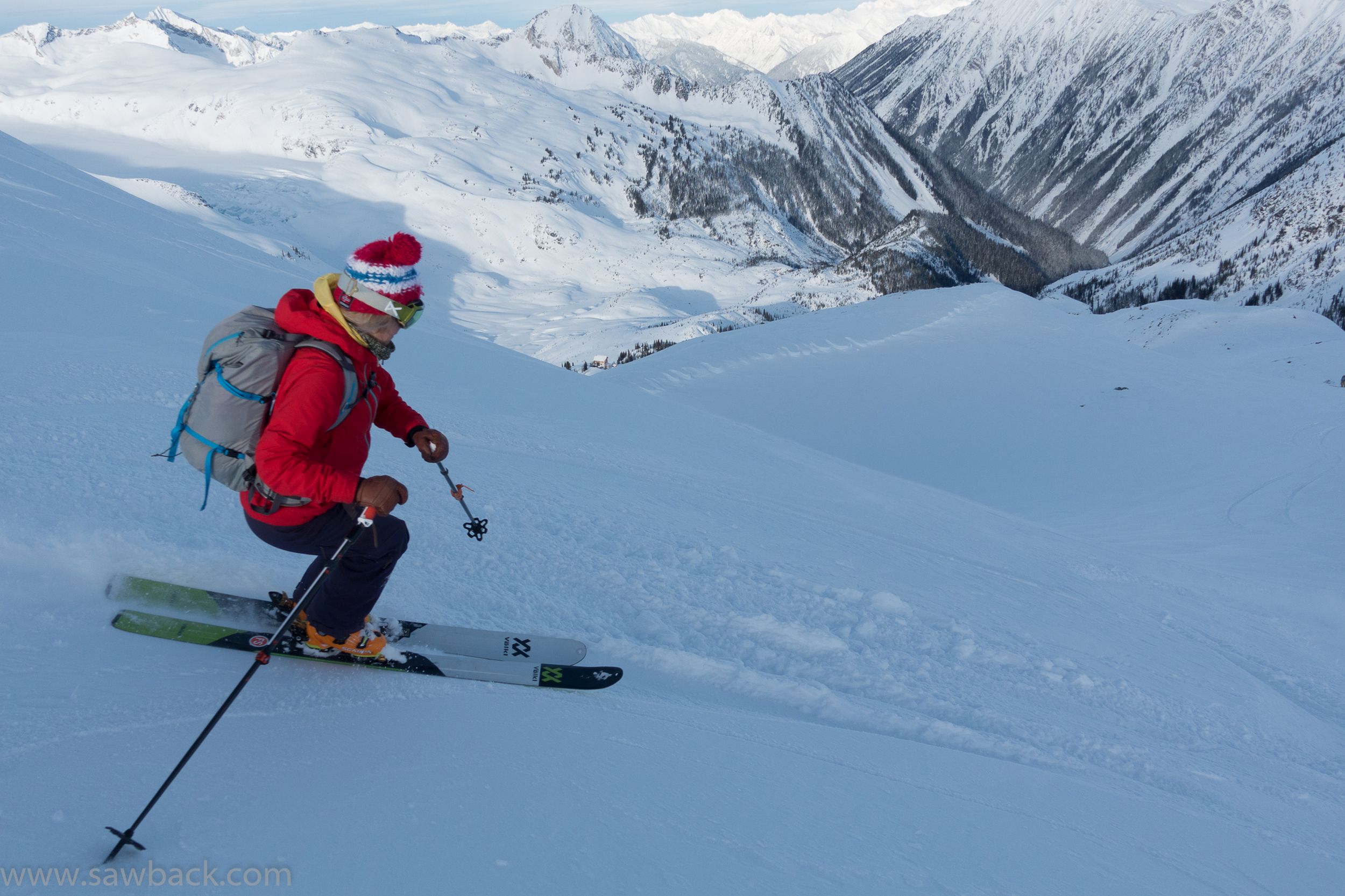 The snowpack at treeline was 250+ cm and on the glaciers over 400 cm. The week was pretty stormy, with 50 cm or more of storm snow coming in little waves day after day. Ski quality was excellent.