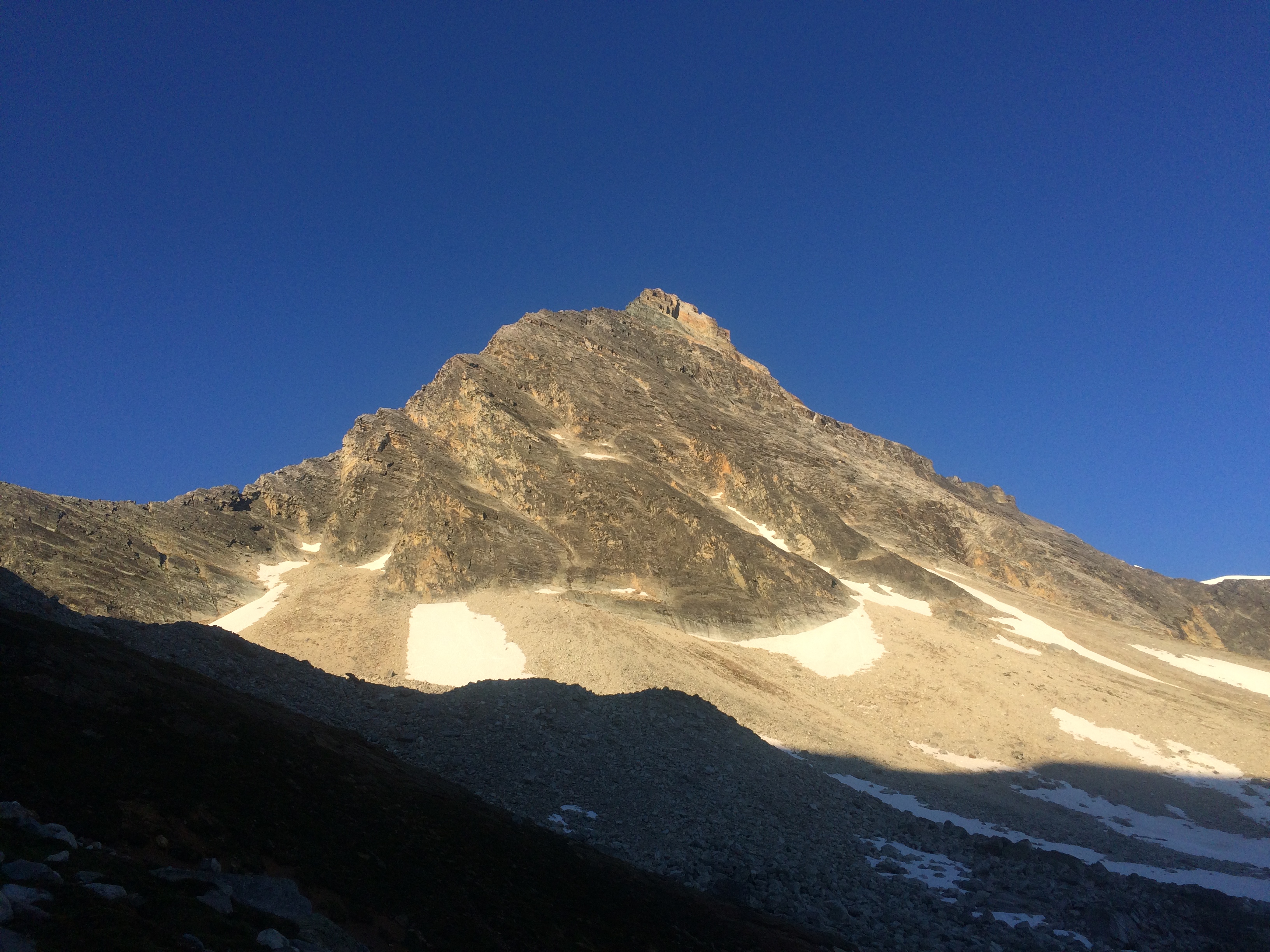 Spent the nights of July 25 and 26 at Mt sir Donald lower bivvy in perfect weather. Both bivvy sites are snow free, and of course the upper bivvy has plenty of adjacent snow for melting, while the lower site has good running water. The approach to the Sir Donald - Uto col can be done with only one 5m stretch of snow to cross, which shouldn't last more than one week. A couple snow patches below the rappels on the Sir Donald descent, which can be bypassed with a little imagination, and snow in the final 4th class section can largely be avoided by taking the optional 2 final raps (ignore the loose one-ringbolt anchor - there is a nice 2-bolt one nearby). Generally firm old snow. A few small patches remain on the west face bypass, reportedly one can skirt these but on slippery peagravel over rock slab, with scant/no protection.