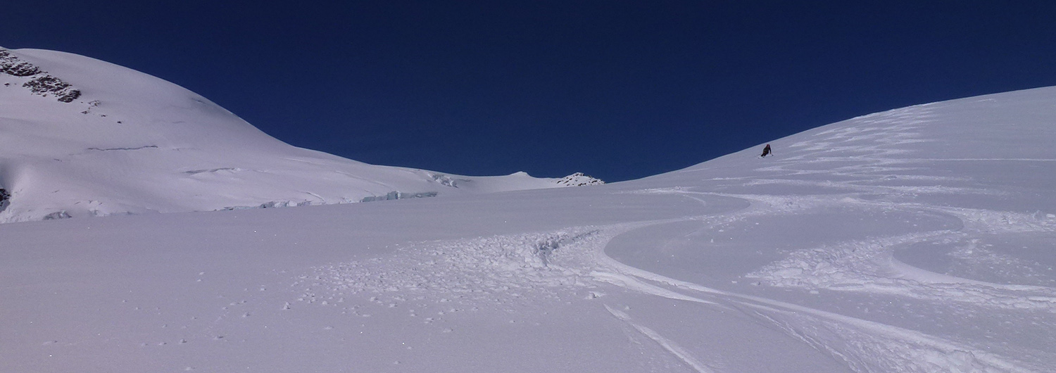 The snowpack was firm and dry in the morning and moist on solar aspects in the pm. There was about 10-15cm of recent new snow above 2900m overlying a very firm 5-10cm crust. This crust was present at all elevation and aspects, it made for great travelling conditions and mostly stable snowpack. We measured upwards of 300cm of settled snow on the glacier above 2500m so good coverage up there.