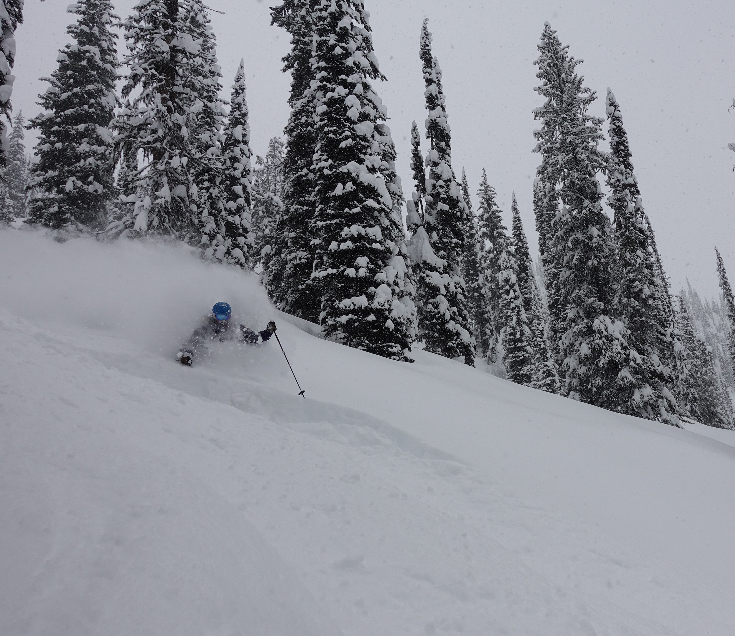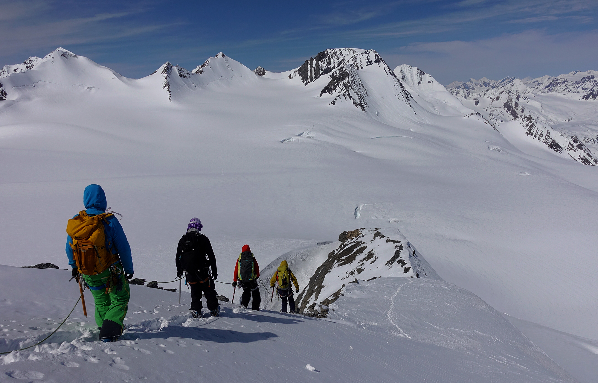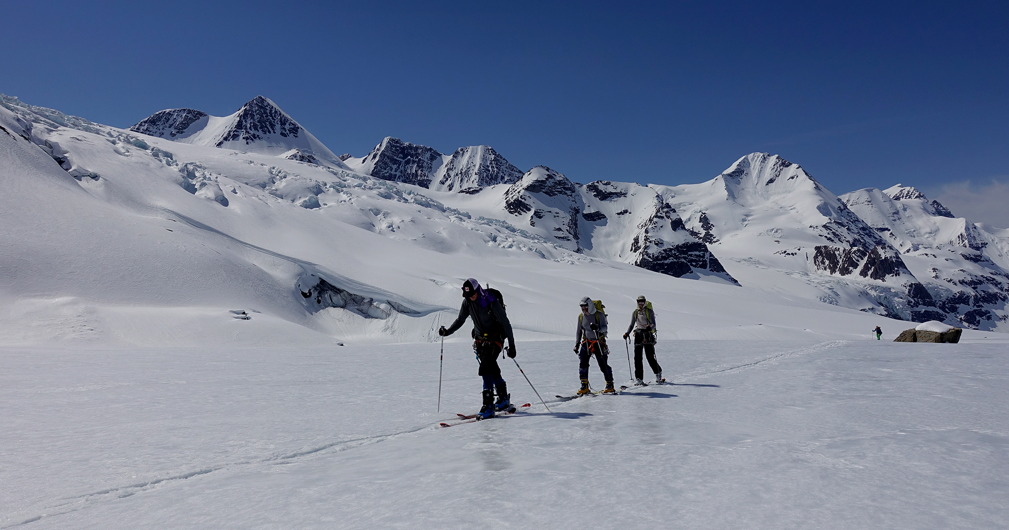 Overall skiing conditions ranged from fair to excellent. With good timing, corn snow was very good on solar aspects early in the week and powder skiing excellent on Northerly aspects last few days. Coverage on the glacier was greater than 350cm and crevasses were generally well bridged but starting to sag with recent heath. Boot packing and cramponing along alpine ridges offered good traction with foot penetration ranging from 0-30cm. Most normal ascent routes and ridges in this area appear in great shape.