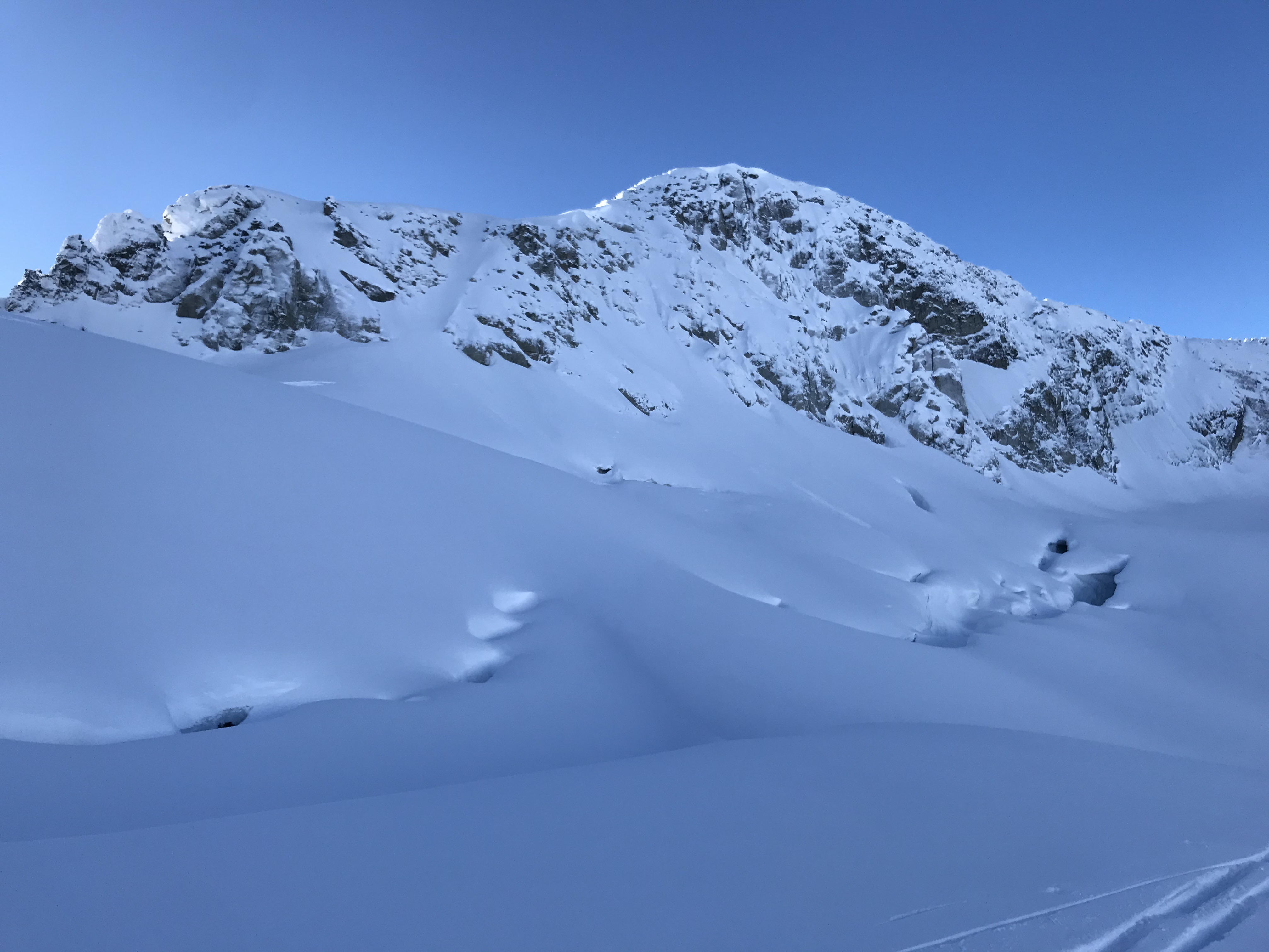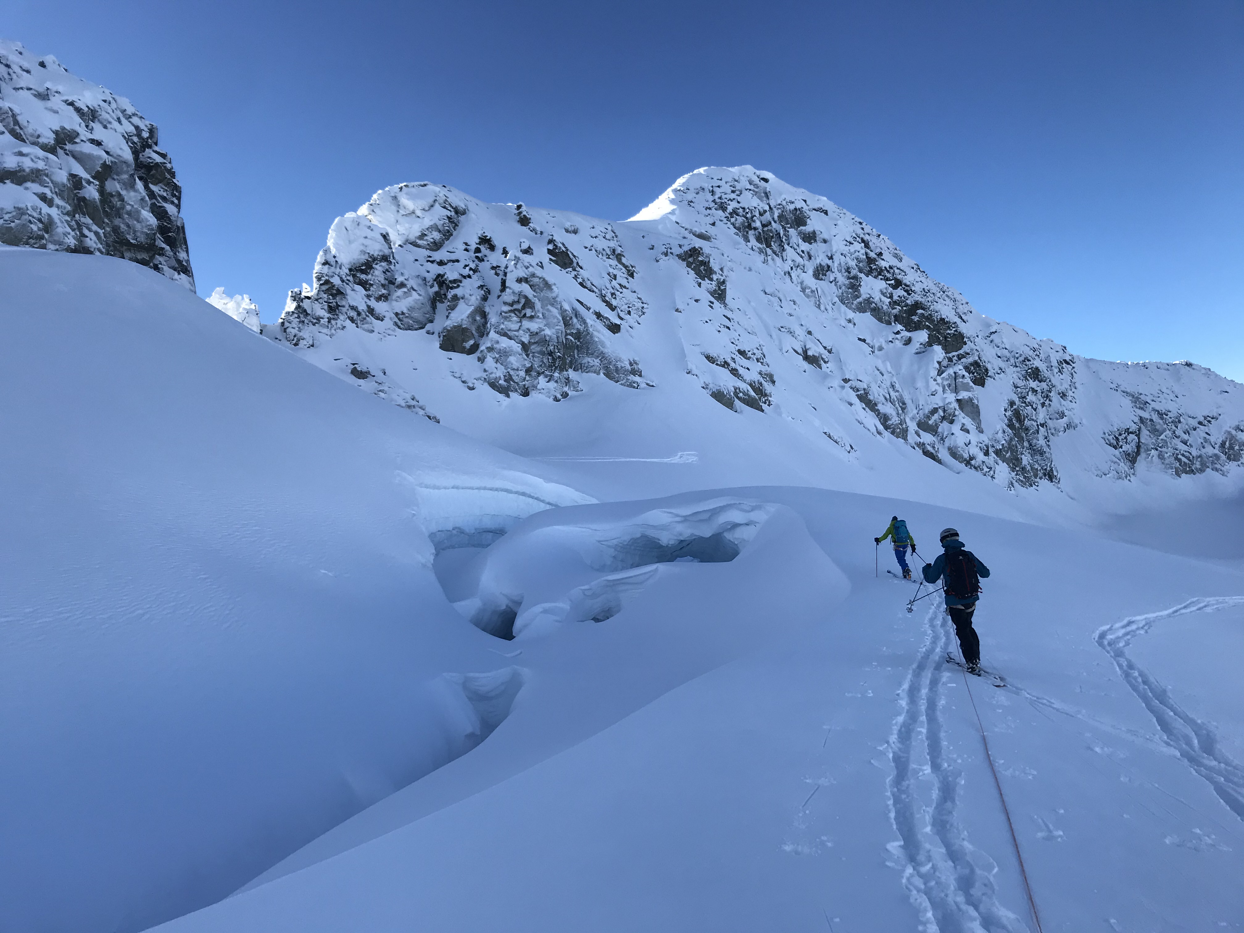 Probing on glaciers showed an average of 100cm-130cm. The Spearhead Gl. was extremely broken with no fall line ski options from the standard Don't Swill and Guides Notch locations. Careful navigation and route finding are needed, as well as some solid crevasse and glacier travel skills.