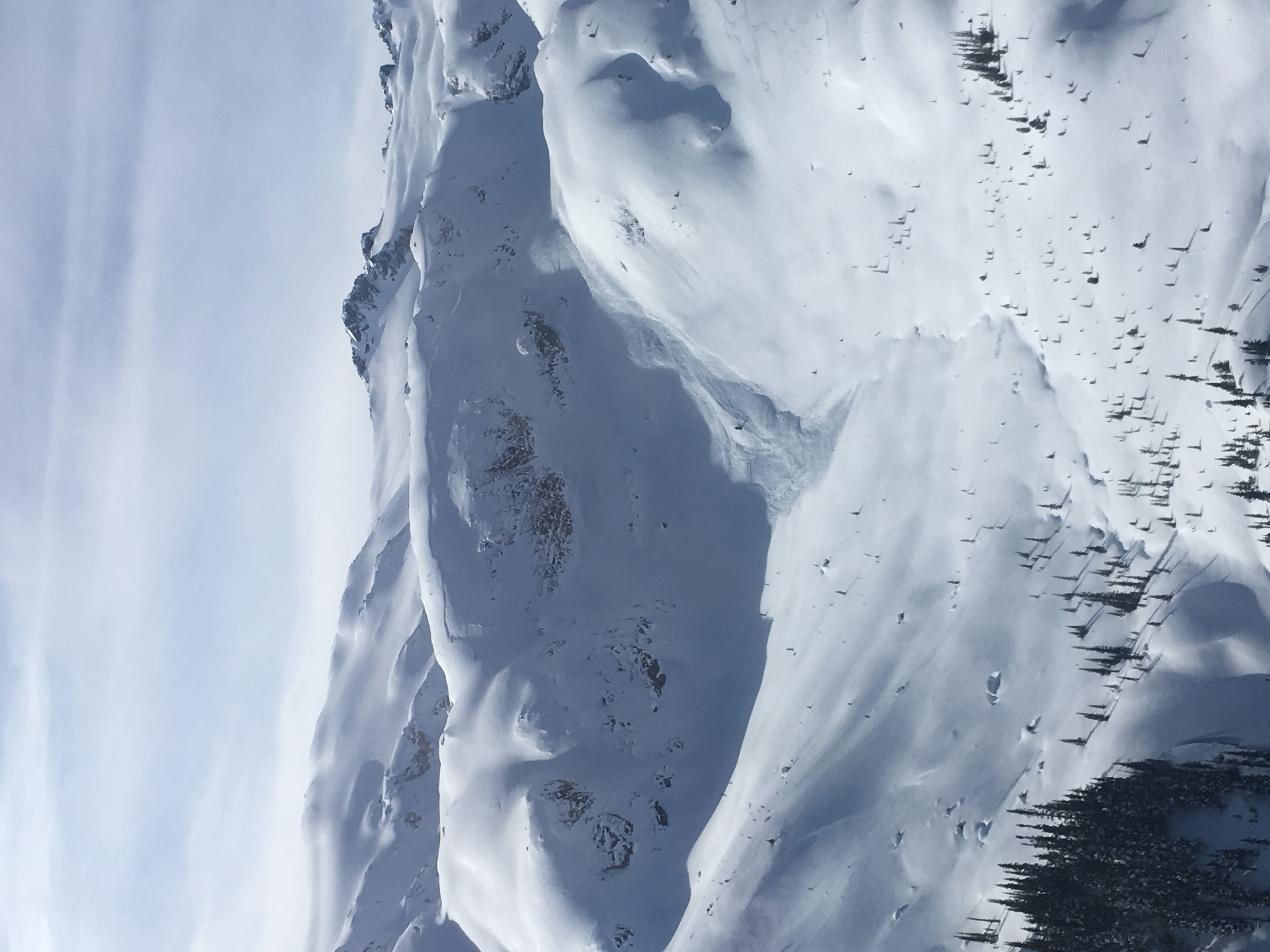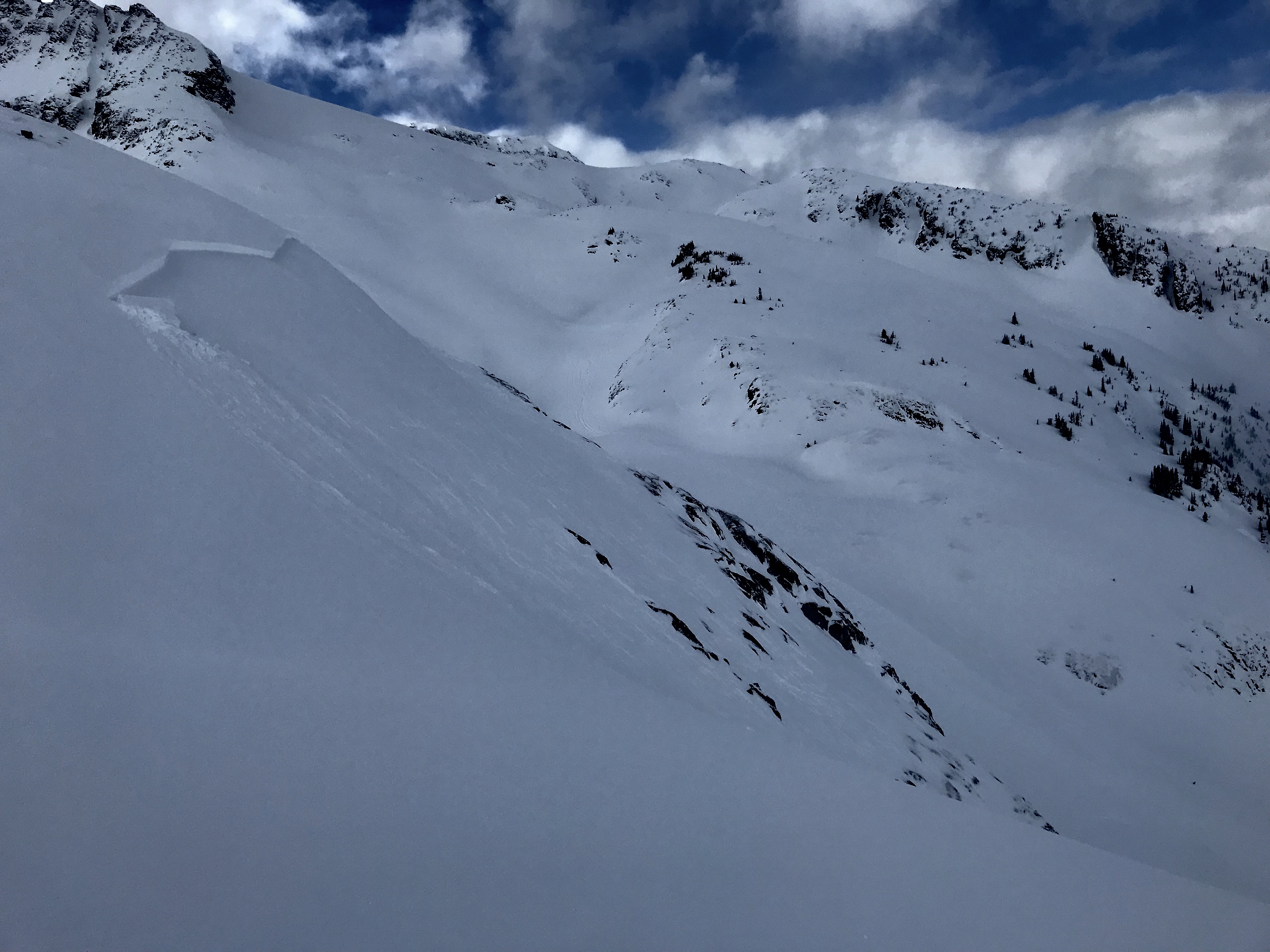 Guided trip down Spearhead Glacier near Saucer Lake. During a regroup for lunch at around 1930m I poked out for a look over the steep rolls below the bottom of the glacier. While skinning out to a flat perch to get a view, I remotely triggered the steeper unsupported slopes to the West from about 60-70m away. I could not see how far this propagated but could see the debris extend out quite far into the basin. From this limited observation I would say this was about a size 2.5-3. It is quite possible that the entire feature released which would mean about 150m-200m across. Fracture depth (observed) was about 40-50cm in the deepest. Failure layer I'm assuming is the Feb 22nd SH. No involvements.