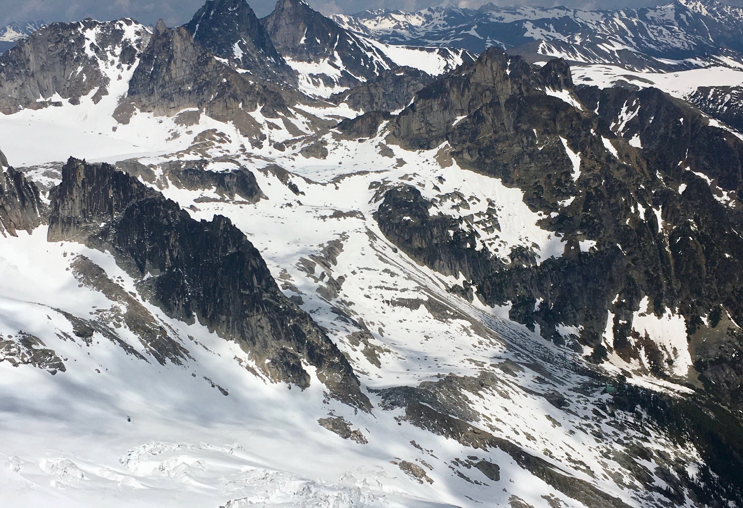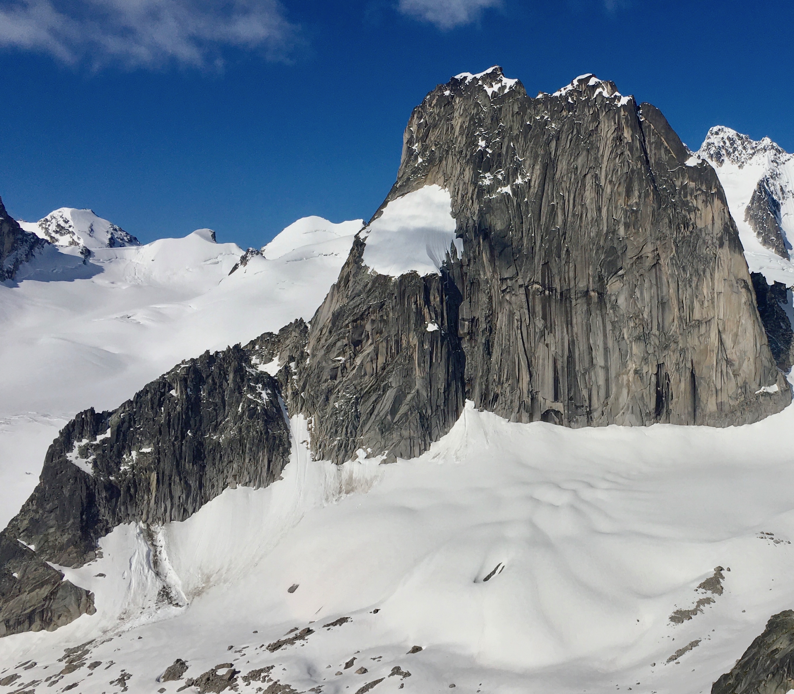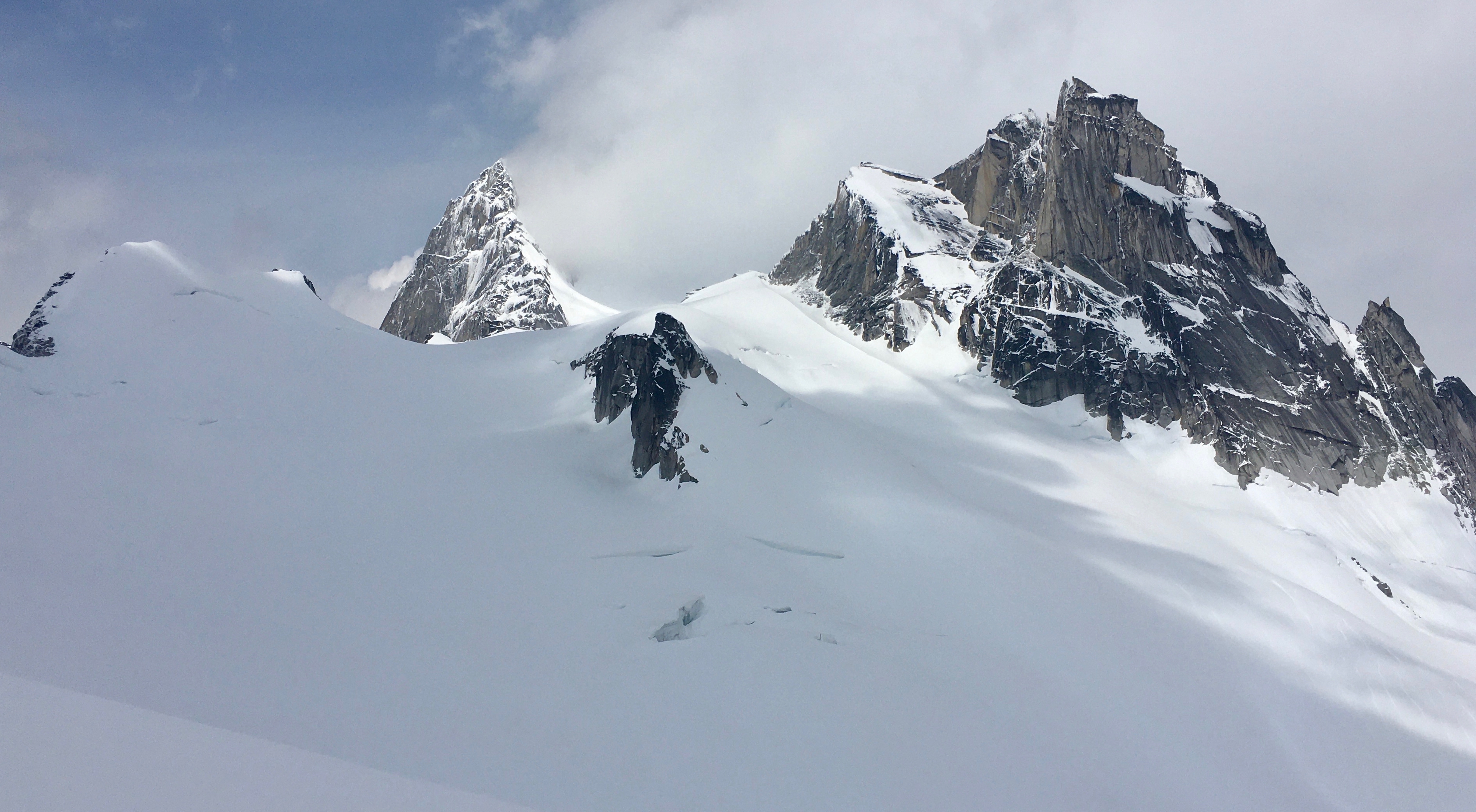 The Pigeon Fork of the Bugaboo Glacier has about a meter of snow at the toe below Son of a Snowpatch, and the travel is fast and easy to the peaks in that area with the crevasses still well bridged.