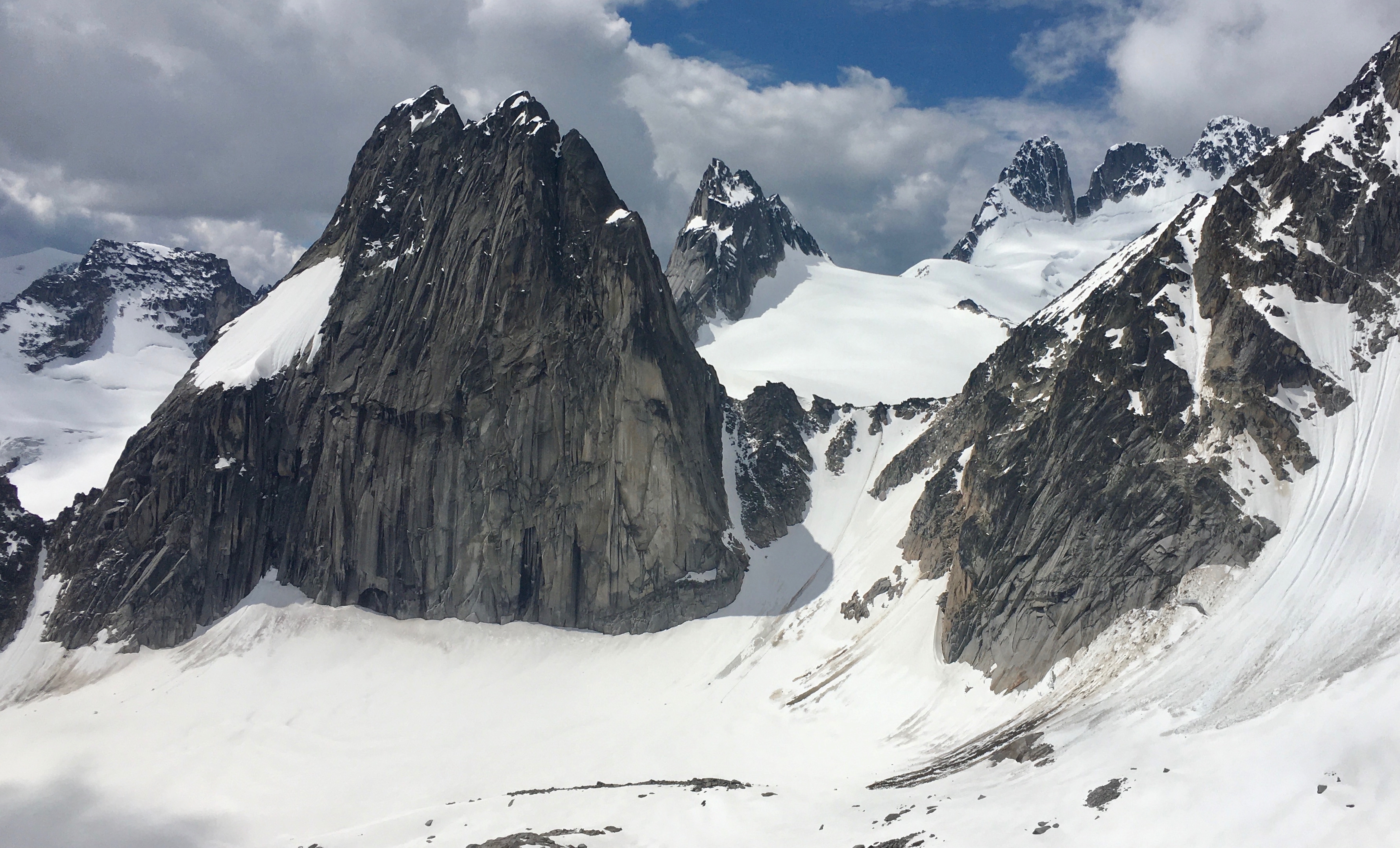 The Central Spires are pretty locked in snow with no reports of successful ascents from the few climbers we talked to. Though one pair of skiers seemed to nail the timing on good corn skiing from the Bugaboo-Snowpatch Col early in the morning on the first sunny day after the last storm. However during the couple of sunny days we had, loose snow avalanches and rockfall were pretty constant by mid afternoon, and several more warm days are needed before the classic routes come in to more typical summer conditions.