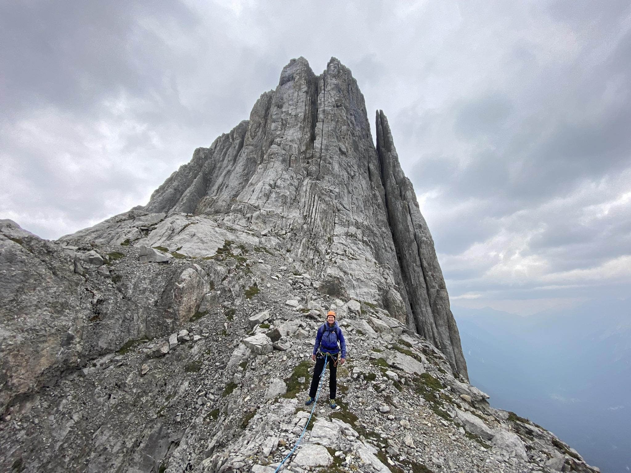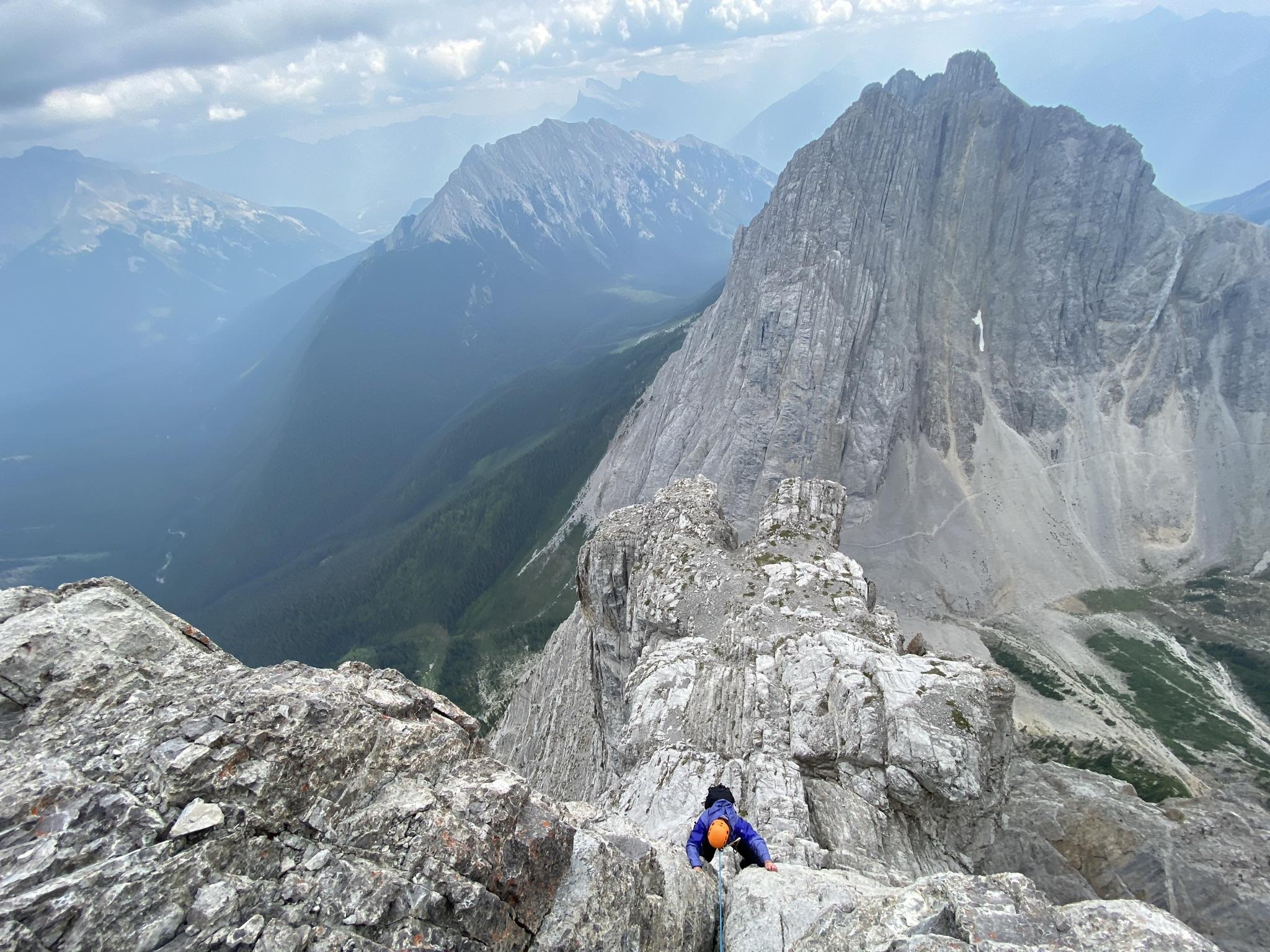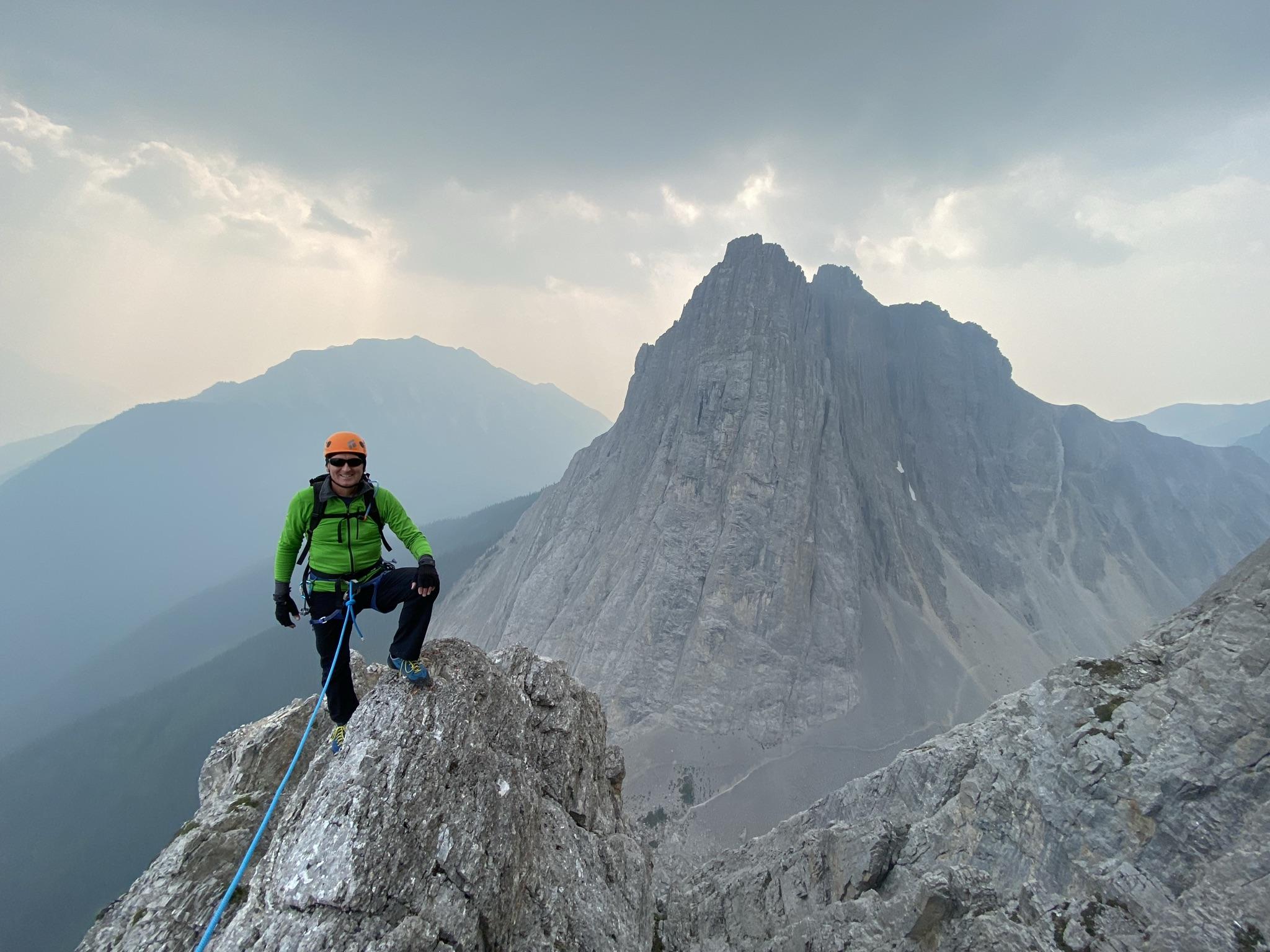 I guided an ascent of the Kain Route on Mt. Louis yesterday. The day was quite smokey and despite the dry forecast, we did get rained on. One thing I have noticed recently is that the smokey skies can make it difficult to determine what the clouds are actually doing. For instance, it can be hard to tell if the skies are simply smokey or if you are about to get unpleasantly surprised by an electrical storm. The day was also surprisingly cold, something I have not experienced much this summer. Otherwise, a great day on an iconic peak.