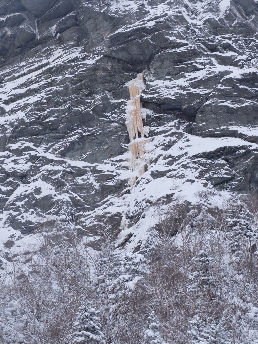 Snoticle was climbed Sunday 1/5. First pitch in lean shape but goes for those comfortable in moderate mixed terrain. Second pitch in good shape. Things in the Notch are otherwise good. Snow that had accumulated throughout the week has mostly cleared off ice routes leaving everything fat and dry. Some wind loading observed on the usual suspects, Easy, Hidden, EHG, etc.. calm winds today but expect things to get interesting Wednesday with new snow, high winds and potentially a short period of rain at all elevations.
