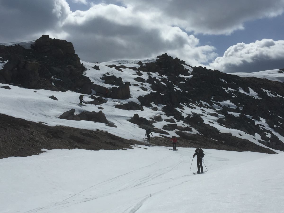 There was a light freeze overnight making for reasonable ski travel. At noon the air temperature was +11C at 2200m. Some broken cloud cover helped reduce the solar effect. By 3:00pm we were breaking through the crust below 2300m as we skied back inbounds. There was up to 115cm of snow at 2200m, but lots of bare patches showing!