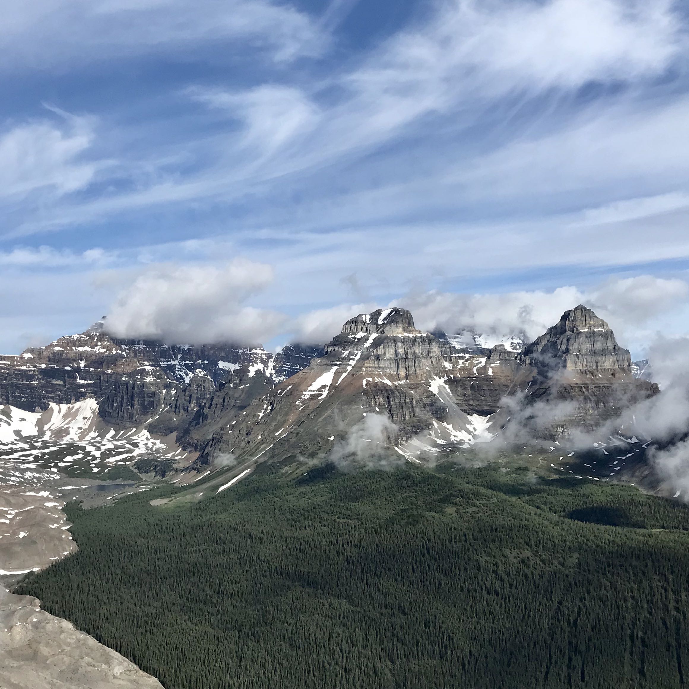 The upper parts of the scramble routes on Temple and Eiffel are still snowy and may need crampons if there is a freeze. The approach slopes to Pinnacle Pk are melted out. E Ridge of Temple is dry to the Big Step but there is still a significant amount of snow on the Black Tower bypass ledges. See photos.